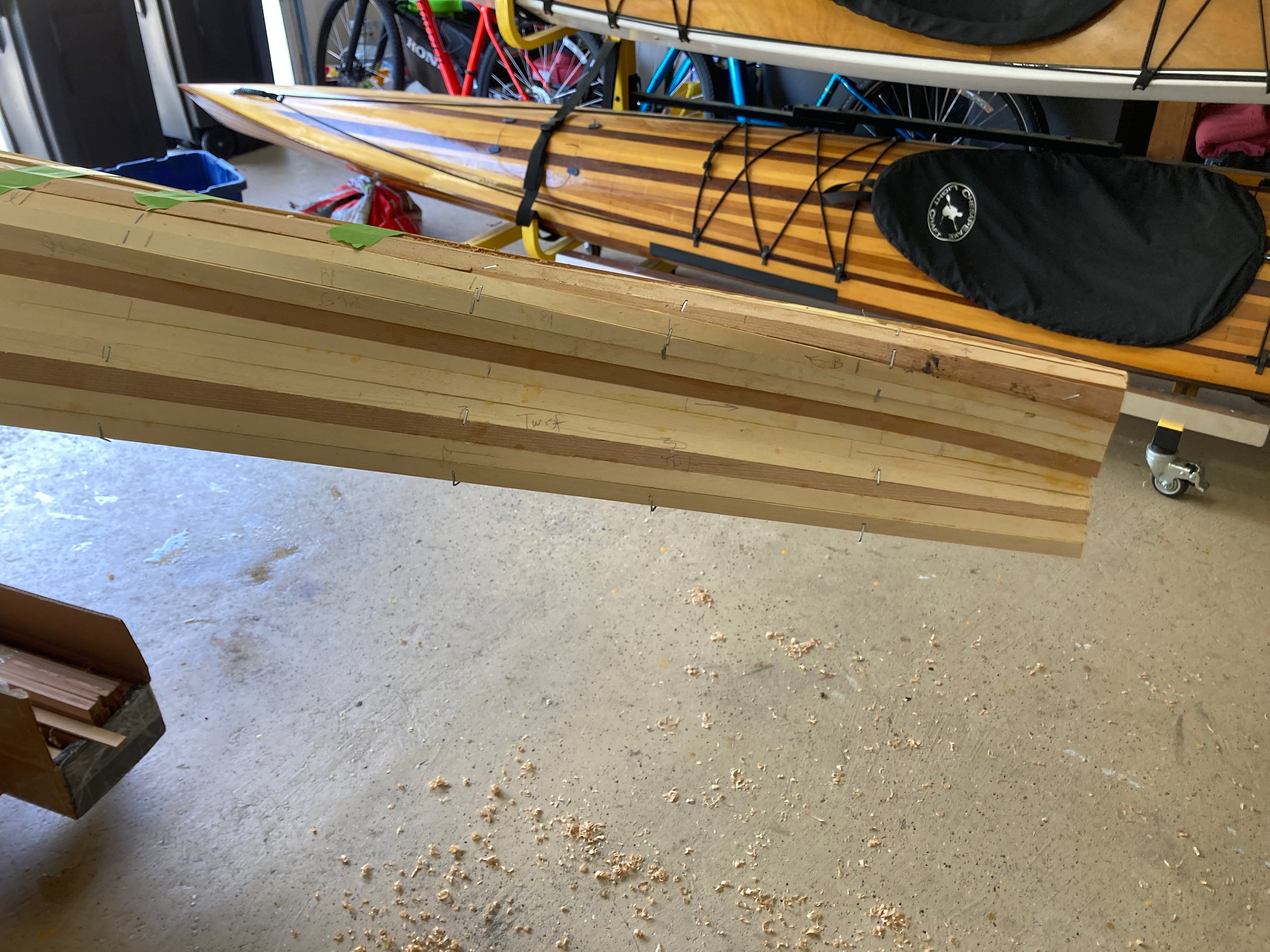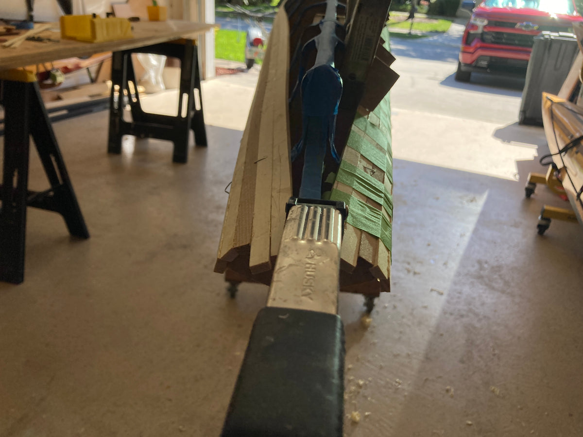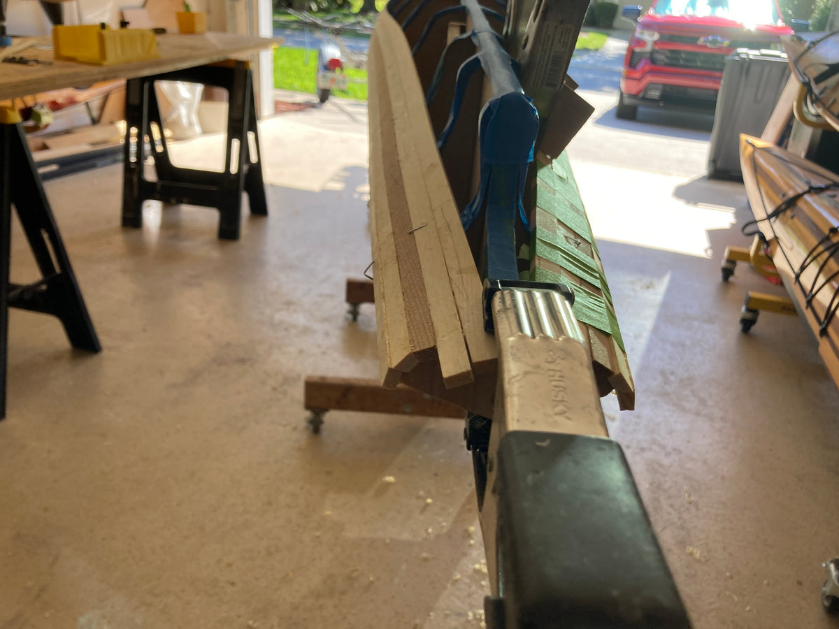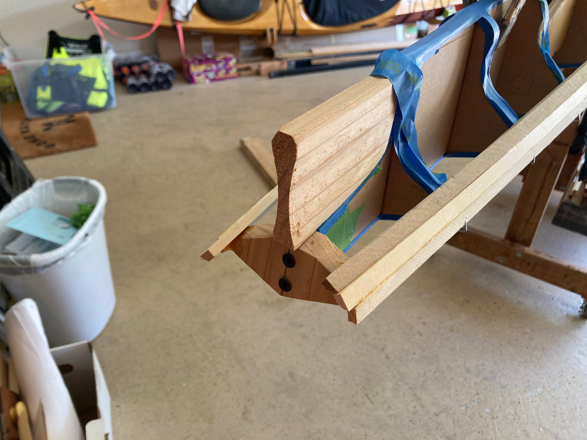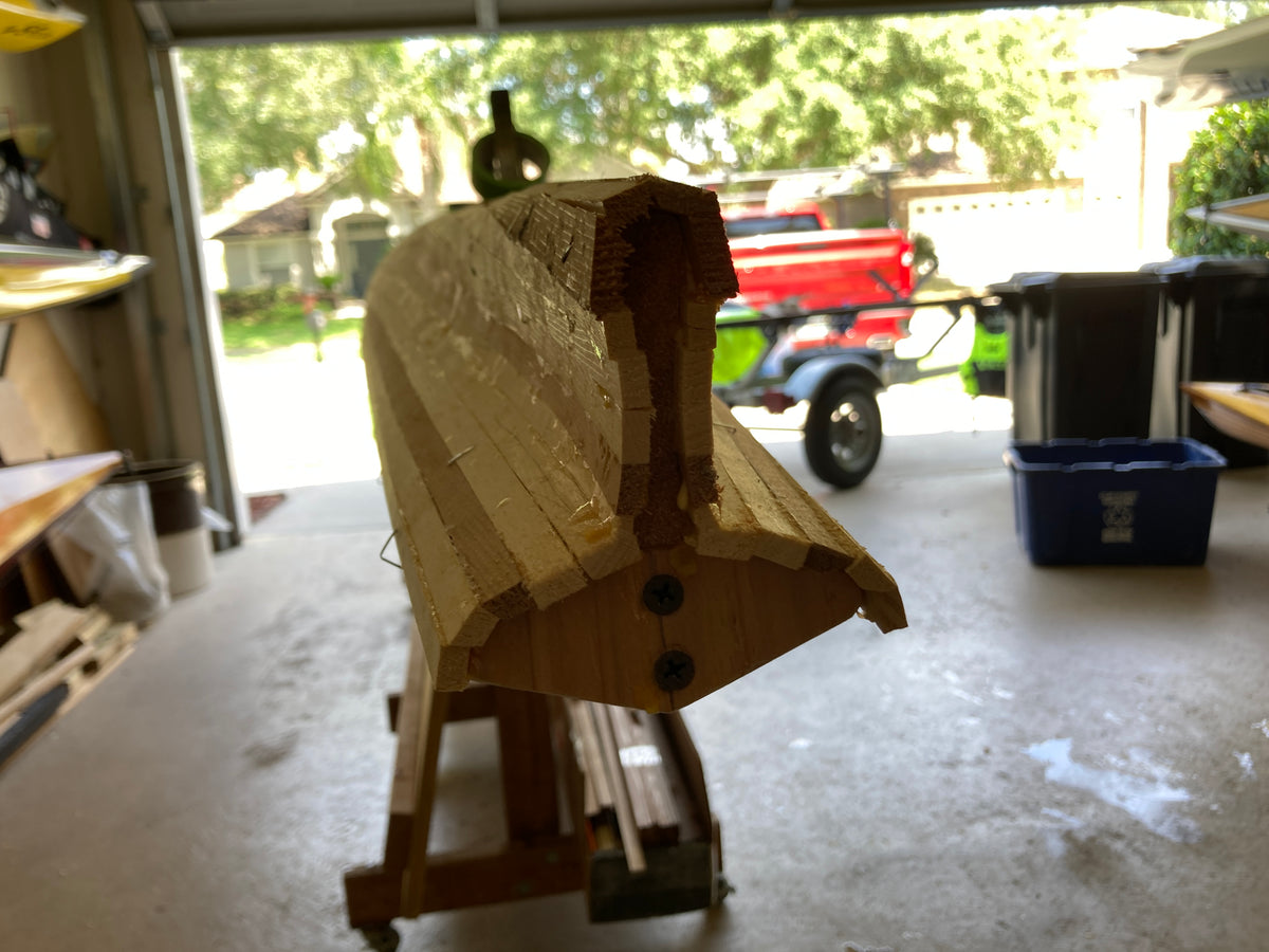 Since performance differences were inevitable, Nick Schade decided it made sense to modify the traditional "iqyax" or single baidarka shape to take advantage of the possibilities of the strip-planking method. The result is this Aleut-like or Aleut "esque" design. Much has been written about the "bi-fid" or split bow of the traditional baidarka. There has been speculation that it acts like a bulbous bow as seen on supertankers, or it is a totem symbolizing a salmon jaw. The theory that was most interesting to him was that it served to create a clean entry at water level, but provided reserve buoyancy above the waterline to help ride over waves. (In a skin-on-frame boat it is hard to pull the fabric into a hollow shape. The easiest way is to sew through the skin, and the best way to make this sewing water tight is to cut down the seam and sew the two sides completely together.) Since strip building does not have the waterproofing issue Nick did not think the difficulty to build open jaws was necessary. So, he merged the upper and lower jaw into one continuous piece.