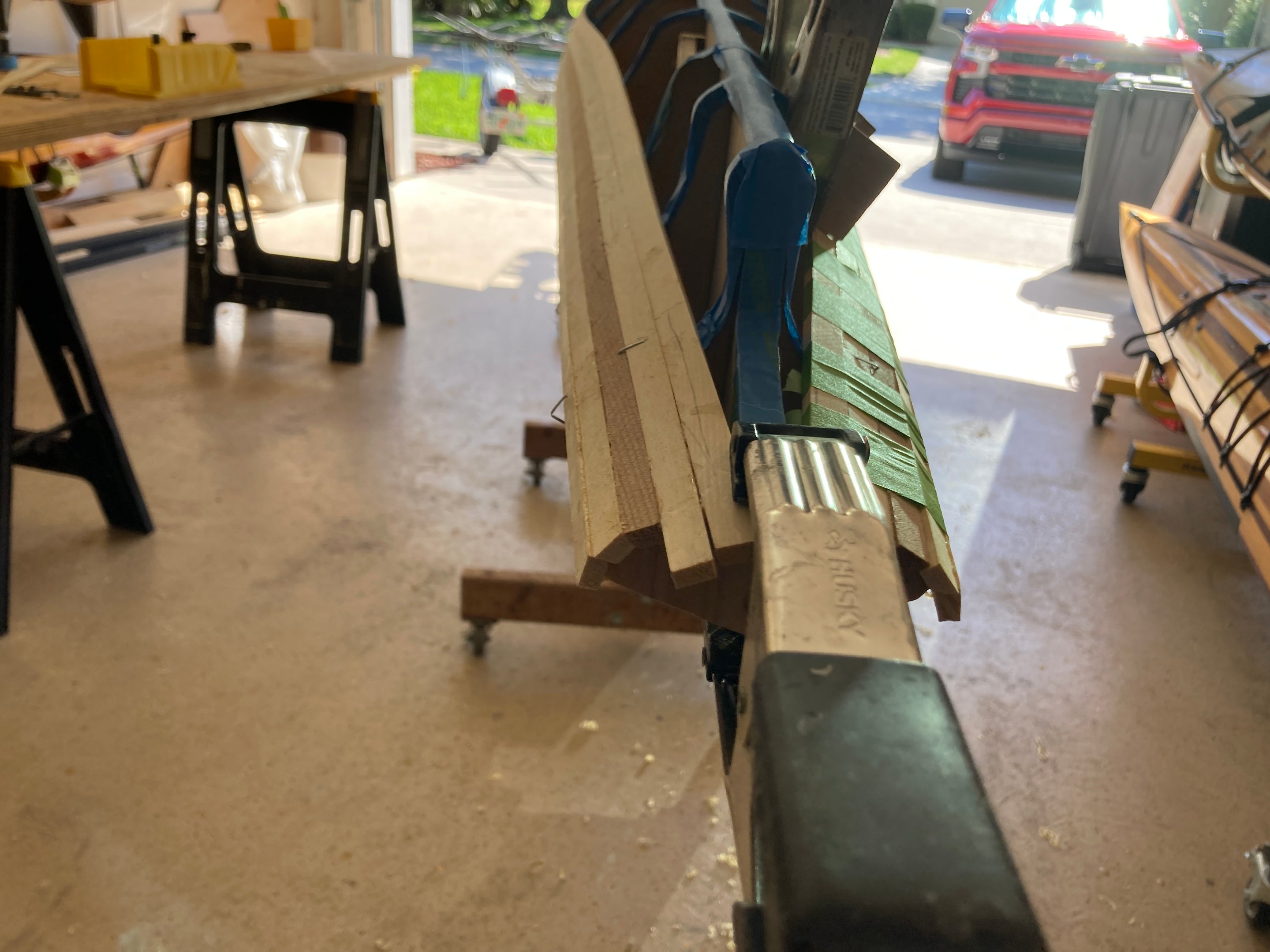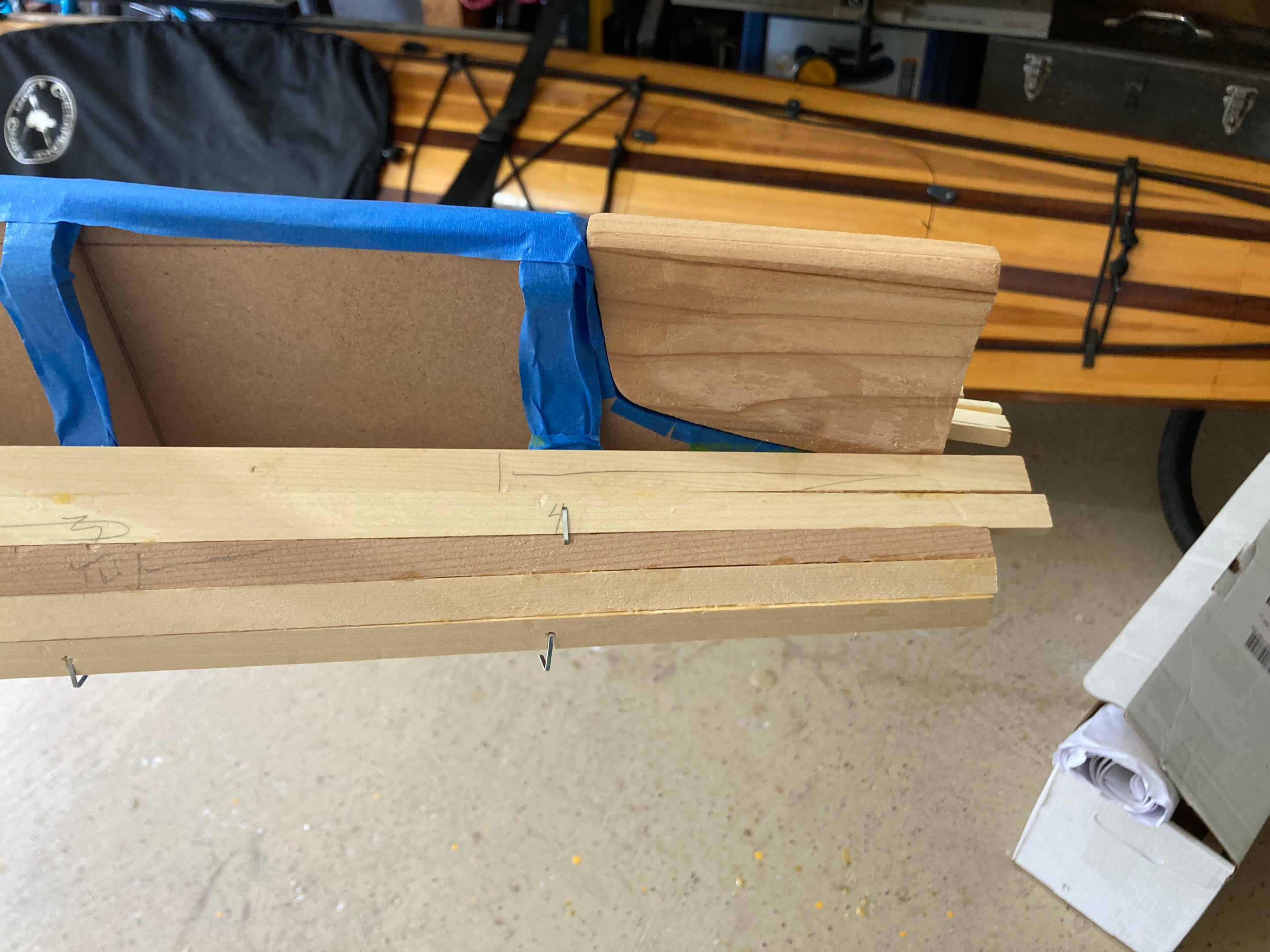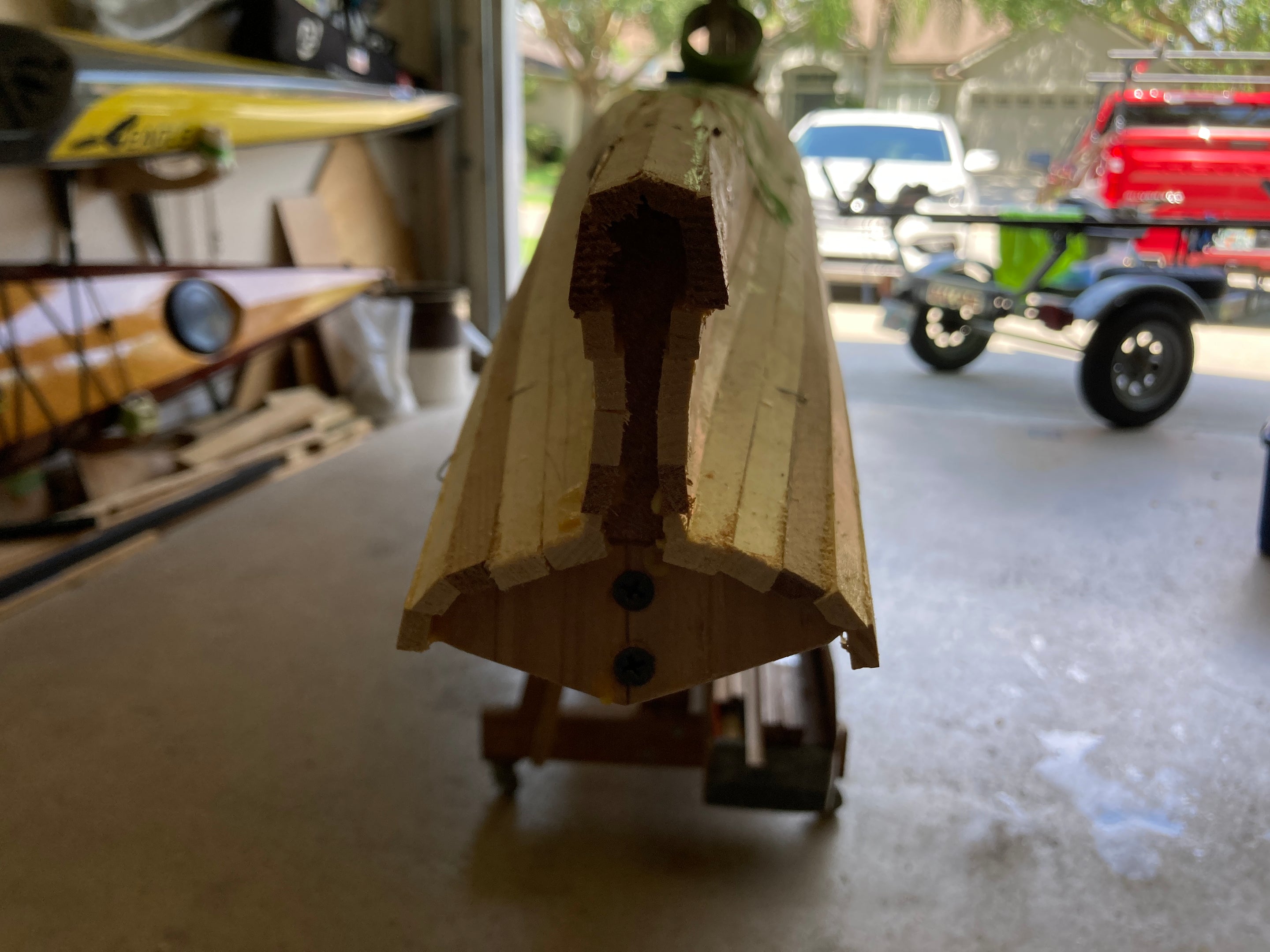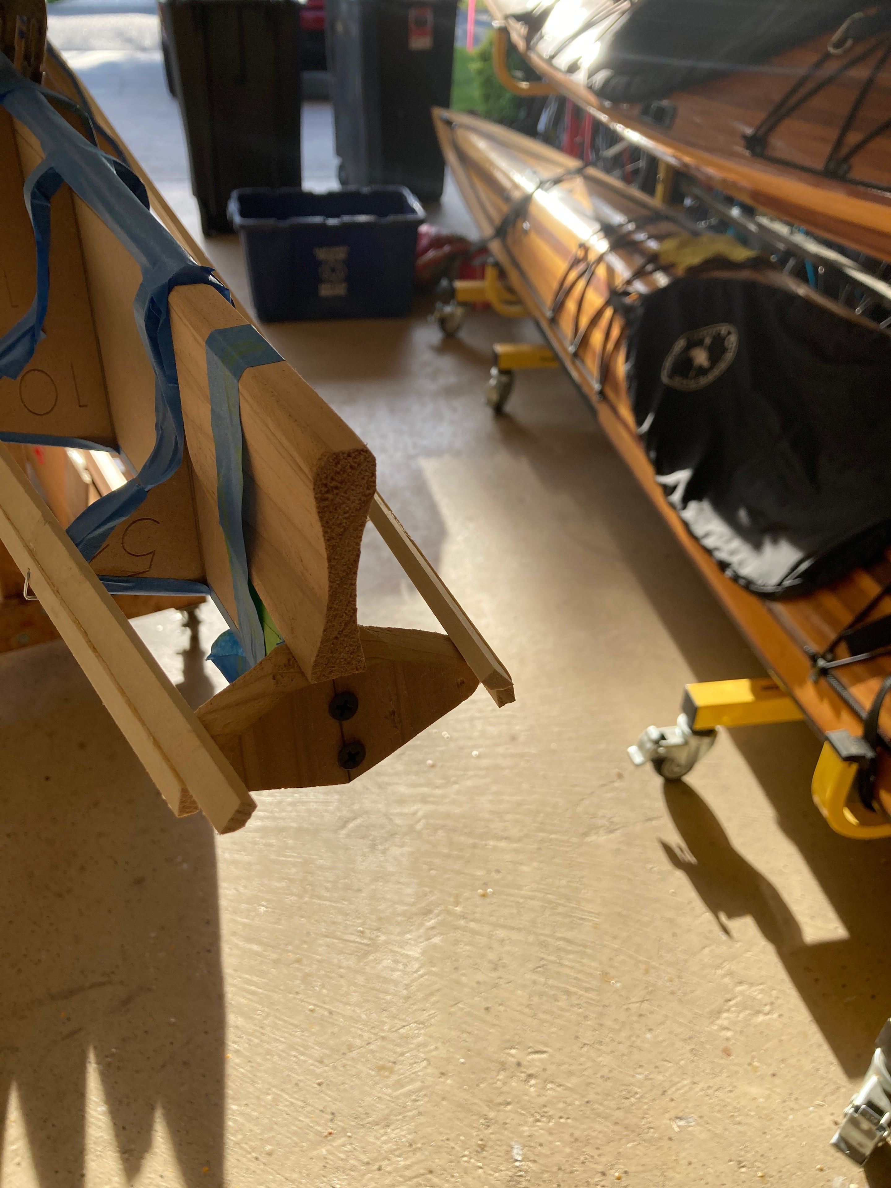 Since performance differences were inevitable, Nick Schade decided it made sense to modify the traditional "iqyax" or single baidarka shape to take advantage of the possibilities of the strip-planking method. The result is this Aleut-like or Aleut "esque" design. Much has been written about the "bi-fid" or split bow of the traditional baidarka. There has been speculation that it acts like a bulbous bow as seen on supertankers, or it is a totem symbolizing a salmon jaw. The theory that was most interesting to him was that it served to create a clean entry at water level, but provided reserve buoyancy above the waterline to help ride over waves. (In a skin-on-frame boat it is hard to pull the fabric into a hollow shape. The easiest way is to sew through the skin, and the best way to make this sewing water tight is to cut down the seam and sew the two sides completely together.) Since strip building does not have the waterproofing issue Nick did not think the difficulty to build open jaws was necessary. So, he merged the upper and lower jaw into one continuous piece.