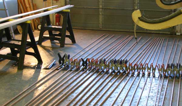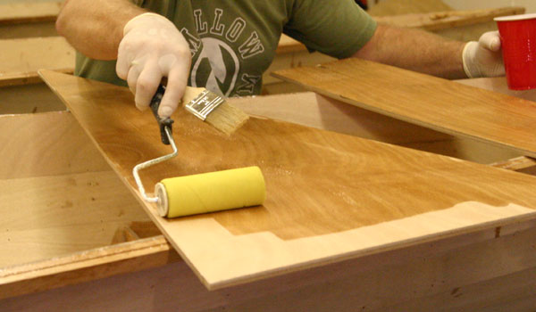 Construction uses Chesapeake Light Craft’s exclusive LapStitch™ process. This results in a true lapstrake hull with long, elegant lines that is stiff and light. The doubling of plank thickness where each plank overlaps the next creates a longitudinal “stringer,” which is why CLC’s LapStitch™ boats don’t require as much messy fiberglass work as multi-chine hulls. The Wherry is built of 6mm okoume BS1088 plywood, epoxy encapsulated throughout. Fiberglass cloth is applied to the bottom panels inside and out for extra stiffness and resistance to beach abrasion. 9mm okoume frames, thwarts, and flotation tanks ensure stiffness. The outwales, breasthook, and quarter knees are solid mahogany.