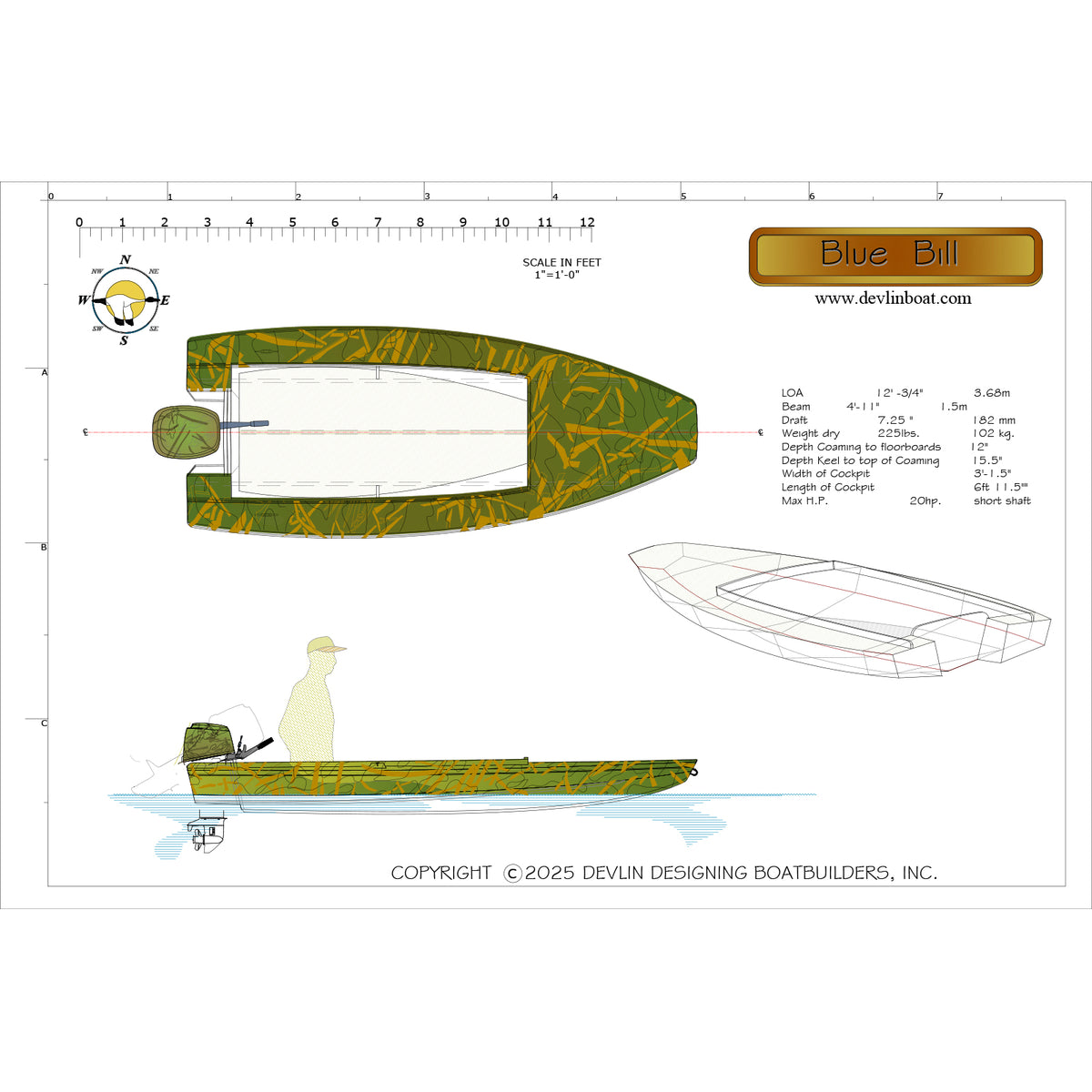 Finally, Sam feels very strongly that not having an outboard hanging off the back of the boat helps you outsmart those wary late season birds. On top of that, it offers the usual Devlin advantages of ruggedness, versatility, and ease of construction. Plans have both Imperial and metric dimensions.