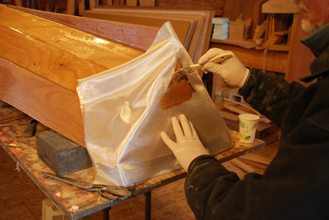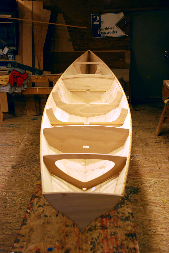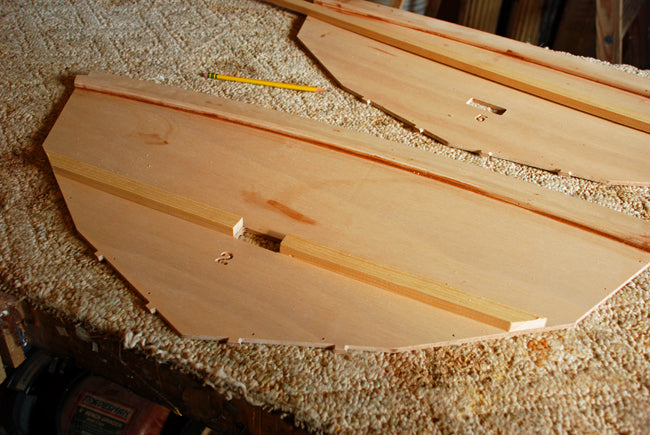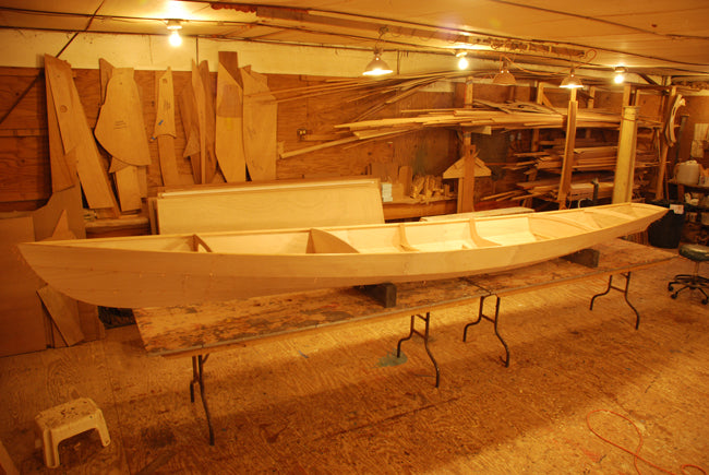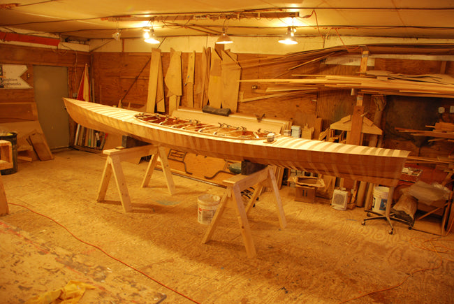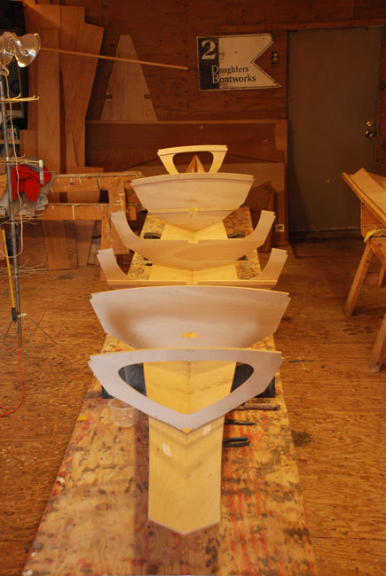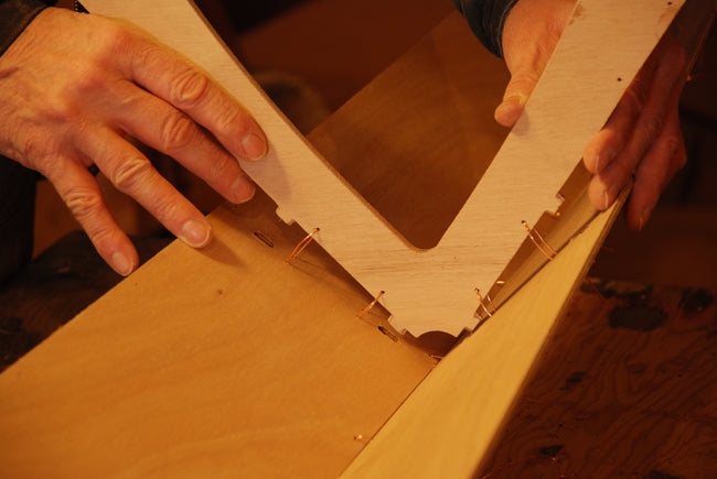 The Expedition Wherry is a multi-chined plywood boat, with a six-panel hull reinforced by six bulkheads. The hull is mostly 4mm okoume plywood, with fiberglass applied both inside and out. The computer-cut kit is intricately designed and highly evolved to suit fast and easy construction, including by first-time builders. Hull panels are snapped together with "puzzle joints," and all of the holes for the temporary wire stitches have been drilled in advance. Plans builders are provided with full-sized patterns for every part. An elaborate step-by-step instruction manual, with photos and drawings of every step, accompanies both kits and plans.