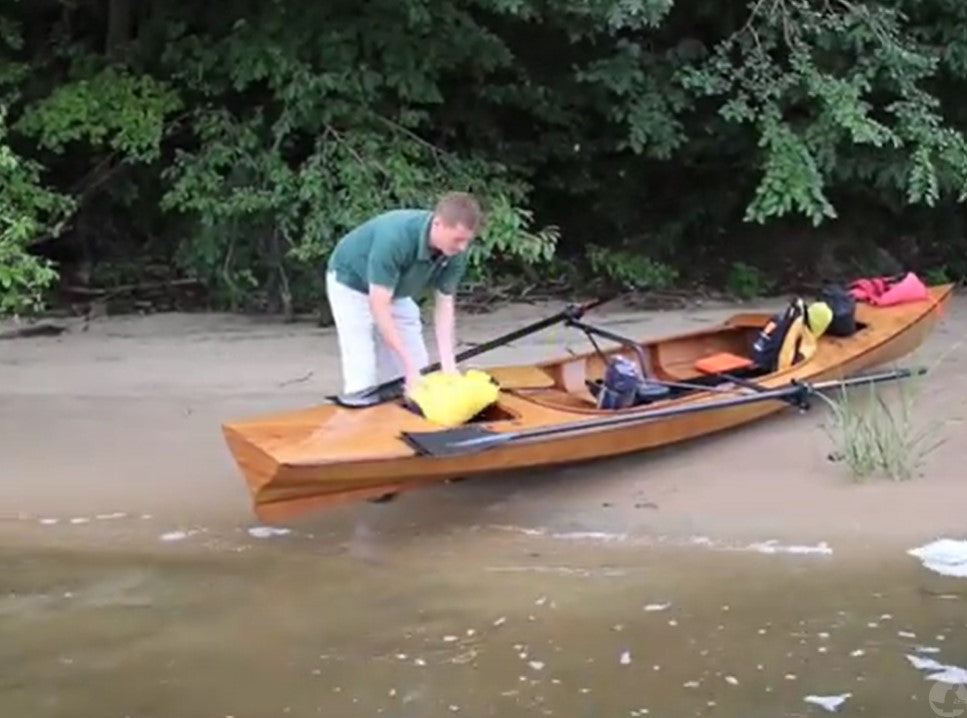 Most of the boat is decked in, with only a small "sump" area beneath the oarsman's heels to gather bilge water. An optional Elvstrom-type bailer can dispose of any water that gathers there. There are four separate watertight compartments, all accessible through hatches for gear storage. The boat has enough stability, and the compartments provide sufficient buoyancy, that it is possible to climb back into the cockpit after a capsize, bail it out, and continue on your way.