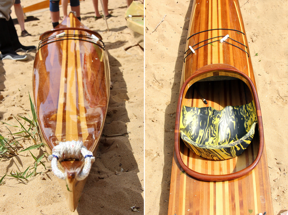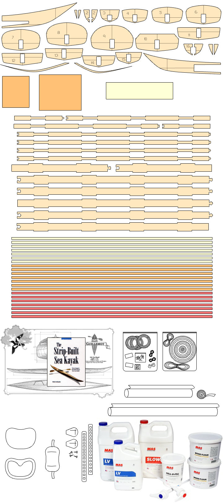 Our strip-built and hybrid kits ship with 50% Western Red and 50% Alaskan Yellow cedar bead & cove strips. Photos on our website and printed materials may show patterns and accent strips with walnut or other materials. Optional walnut strips are available and can be shipped with kit orders.