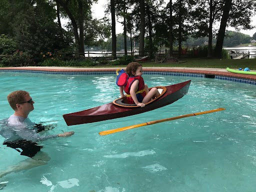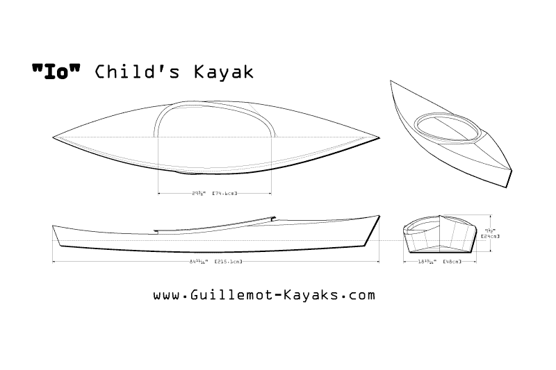 Io is a 7-foot-long child's kayak built in a weekend or two from a single sheet of plywood. The payload for the Io is a maximum of around 75 pounds. The prototype Io weighs an astonishing 12.5 pounds (5.7kg). Io is light enough that if you are in a kayak or other boat alongside your child, you can pick up and empty Io and help the child climb back in after a capsize. Construction is extremely simple, but rugged enough for real use. The small components make for an unusually economical kit (especially when it comes to shipping!).
