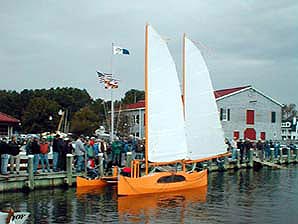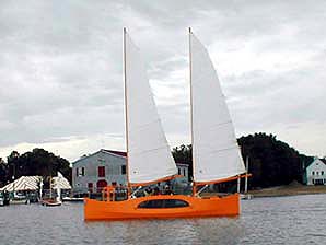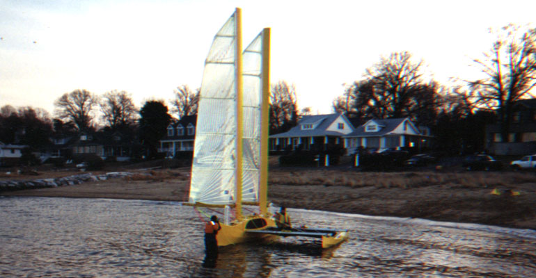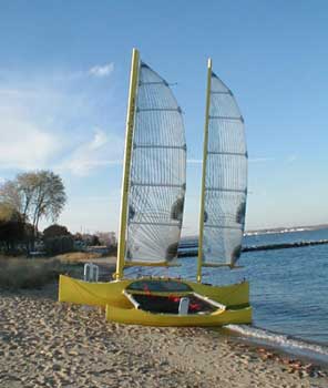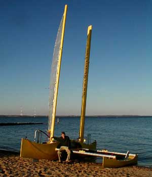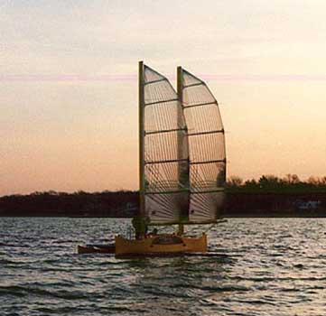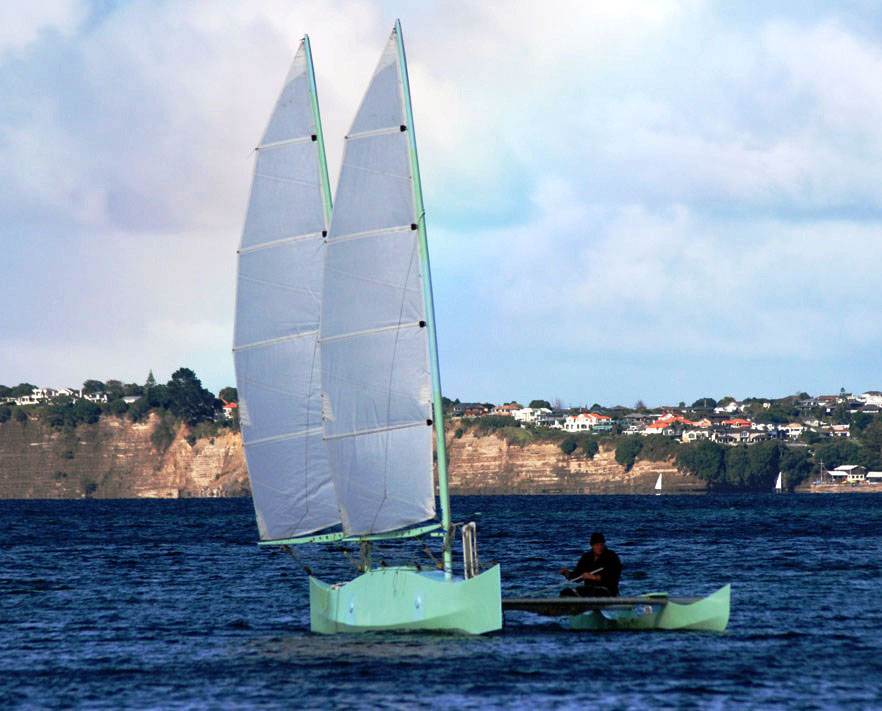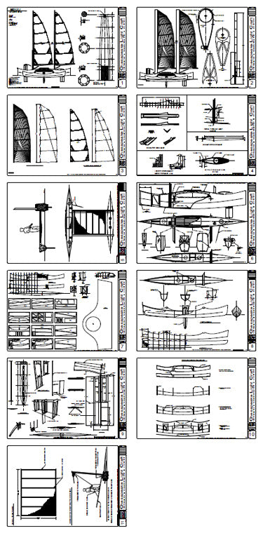 Construction is of 1/4" okoume plywood covered with epoxy and fiberglass. Plans are not extravagantly detailed and are intended for builders who may have built a small boat or two. The lifting rudder-daggerboards and the hollow masts are the most challenging part to tackle. Total cost of the project, including the best materials, high quality sails, and a lightweight trailer should be under $10,000.