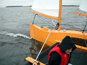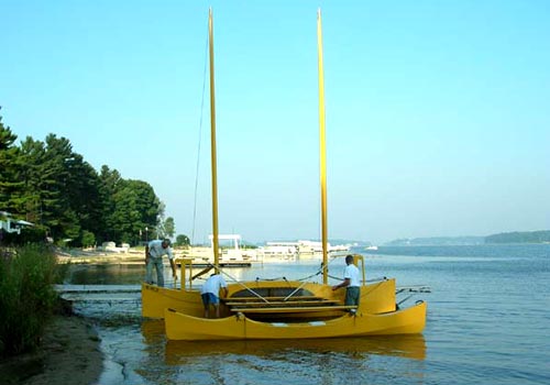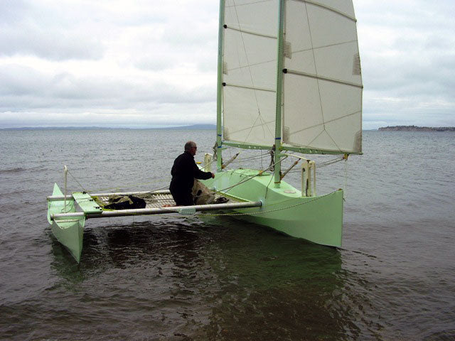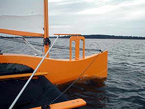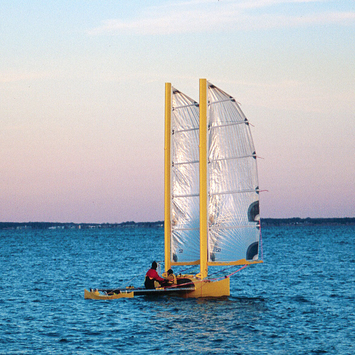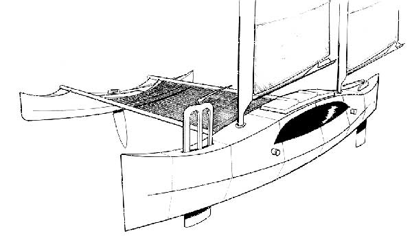 The need to "shunt" instead of tack in the traditional manner is one of the Pacific proa’s idiosyncrasies, but there’s a reason for it: proas can have larger rigs than other multihulls of equivalent length, and can also be 30% lighter even with that larger rig. All this translates into a lot of speed in a small, lightweight package. The all-up weight using Okoume plywood is around 450 lbs., with that much again available for crew and cargo.