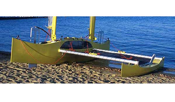 A Pacific proa is a type of sailing canoe that has been widely used in the South Pacific for thousands of years. Mbuli is obviously a modernized proa, but the principle is the same: there is a big hull, which holds the rig and accommodations, and is attached to a small hull to windward for stability. In this case the crew operates the proa from the trampoline stretched between the two hulls.