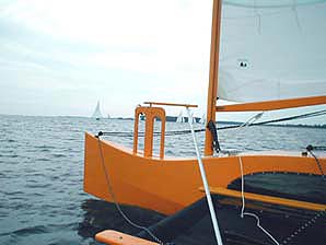 Mbuli has a small watertight enclosed cabin measuring 8’ x 2’. This compartment is kept closed under sail, but at anchor or on the beach it makes a nice sleeping space for one adult. The big windows ensure that you don’t get claustrophobic. Many builders will elect to sleep on the 8’ x 10’ trampoline. You could even erect a traditional tent on the trampoline. The bow and stern have watertight compartments and are available for storage. Additional storage for anchor and lines are provided in the ama.