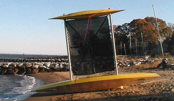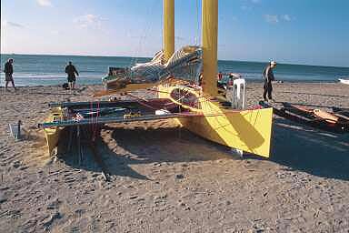 The unstayed schooner rig was chosen for easy handling. The prototype’s wing masts permitted awesome speeds, but they were very tricky and expensive to build and require a highly skilled and athletic crew. The hollow, tapered masts shown in the drawings will offer exhilarating speeds without compromising Mbuli’s beach-cruising style and were used on subsequent boats built from the plans.