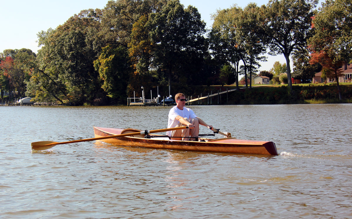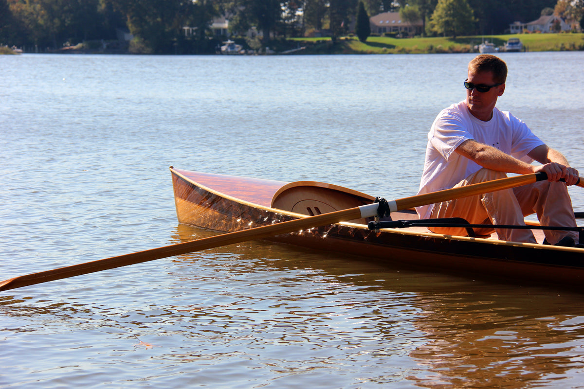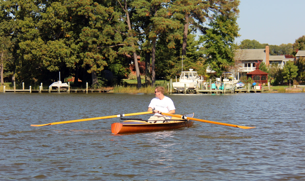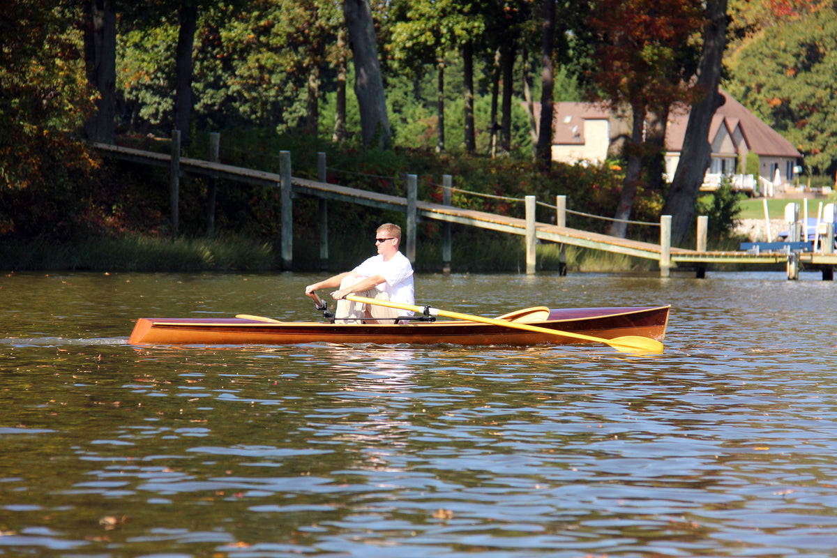 The Noank Pulling Boat is an open-water shell design by Nick Schade. The design has enjoyed a long development; we got to row a version of it in 2014. Now it is available as a complete kit, or in the form of full-sized plans for scratch-builders. If you're looking for a sleek, fast sliding seat rowing boat that may sometimes be used in choppy waters, this is a great choice. At 18' long it's a reasonably compact package compared to a traditional shell, but has the waterline length for a real turn of speed. Meant for reasonably experienced rowers, the hull is slack-bilged and slippery. A shallow skeg aft provides ample tracking even while surfing. The Noank Pulling Boat doesn't have the volume for a second rower or passenger, but a single crew could pack quite a lot of camping gear into the watertight compartments at the bow and stern. The interior has been designed around this excellent drop-in sliding seat unit. Built of cedar strips, this will be a stiff and light wherry, and a head-turner, too. Designer Nick Schade writes: "Noank is a village on the coast of Fishers Island Sound in Connecticut with a long tradition of boat building. I first visited Noank as a young child to go sailing on my uncle's hand built wooden sloop. At that time there were still hulks of wooden schooners moldering into the shore front. Now Noank is best known as the location of a restaurant offering a fantastic hot lobster roll, just hot lobster, melted butter and a toasted bun. What better way to earn those calories than to row up to the restaurant dock in a beautiful wooden pulling boat? "The Noank Pulling Boat grew out of my desire for a fast, efficient rowing boat that could handle the chop of Fishers Island Sound. I wanted something elegant and easily driven. The Noank has two roomy storage compartments in the ends that offer plenty of reserve buoyancy or capacity to load up for a extended camping tour.. "Strip-building offers a great way to make a lightweight hull with an efficient shape in the water. I opted to rig it with the Piantedosi Row-Wing drop-in unit as a well-engineered, reliable system, instead of expecting DIY builders to to successfully build the equivalent by hand and still achieve the requisite stiffness and solid construction."