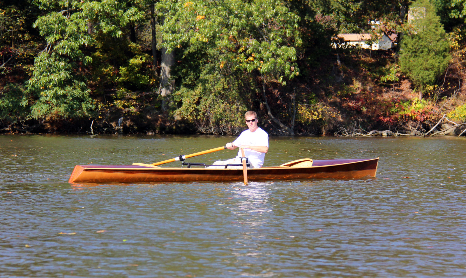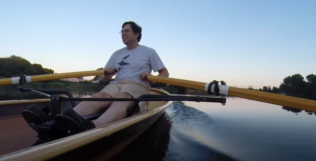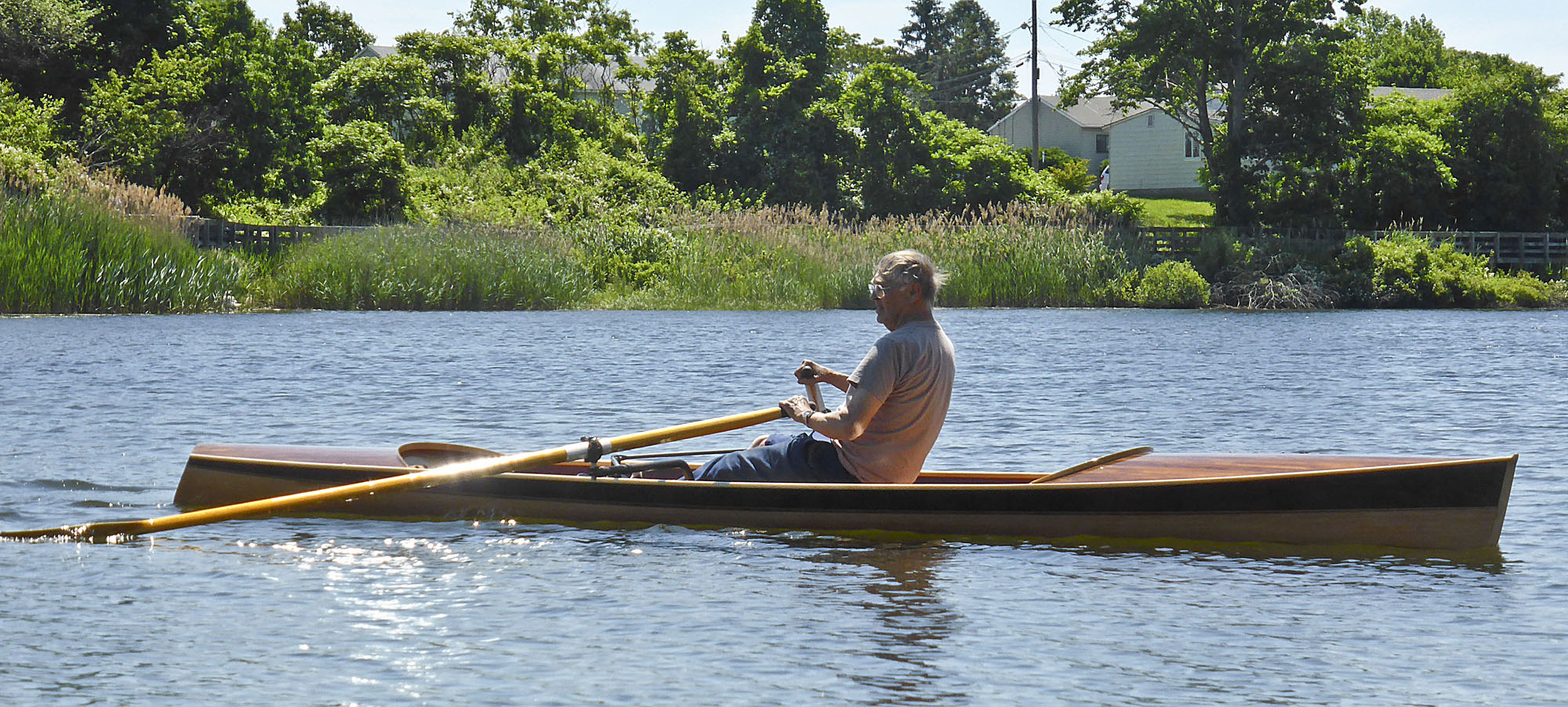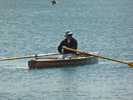 The Noank Pulling Boat is an open-water shell design by Nick Schade. The design has enjoyed a long development; we got to row a version of it in 2014. Now it is available as a complete kit, or in the form of full-sized plans for scratch-builders. If you're looking for a sleek, fast sliding seat rowing boat that may sometimes be used in choppy waters, this is a great choice. At 18' long it's a reasonably compact package compared to a traditional shell, but has the waterline length for a real turn of speed. Meant for reasonably experienced rowers, the hull is slack-bilged and slippery. A shallow skeg aft provides ample tracking even while surfing. The Noank Pulling Boat doesn't have the volume for a second rower or passenger, but a single crew could pack quite a lot of camping gear into the watertight compartments at the bow and stern. The interior has been designed around this excellent drop-in sliding seat unit. Built of cedar strips, this will be a stiff and light wherry, and a head-turner, too. Designer Nick Schade writes: "Noank is a village on the coast of Fishers Island Sound in Connecticut with a long tradition of boat building. I first visited Noank as a young child to go sailing on my uncle's hand built wooden sloop. At that time there were still hulks of wooden schooners moldering into the shore front. Now Noank is best known as the location of a restaurant offering a fantastic hot lobster roll, just hot lobster, melted butter and a toasted bun. What better way to earn those calories than to row up to the restaurant dock in a beautiful wooden pulling boat? "The Noank Pulling Boat grew out of my desire for a fast, efficient rowing boat that could handle the chop of Fishers Island Sound. I wanted something elegant and easily driven. The Noank has two roomy storage compartments in the ends that offer plenty of reserve buoyancy or capacity to load up for a extended camping tour.. "Strip-building offers a great way to make a lightweight hull with an efficient shape in the water. I opted to rig it with the Piantedosi Row-Wing drop-in unit as a well-engineered, reliable system, instead of expecting DIY builders to to successfully build the equivalent by hand and still achieve the requisite stiffness and solid construction."