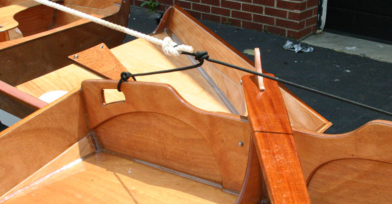 We've had hundreds of requests for a take-apart dinghy. Take-aparts or "nesting" dinghies can be disassembled to take up less space when stored on the deck of a trawler or sailing yacht. The Passagemaker Take-Apart is identical to the standard kit, except that the front 45" unbolts and stows in the rear 93" of the hull. The interiors of both standard and Take-Apart versions are identical; there are no compromises made to rowing, sailing, powering, or towing ability in the Take-Apart design, although the Take-Apart weighs about four pounds more. Outwardly it's actually difficult to tell the difference between them.