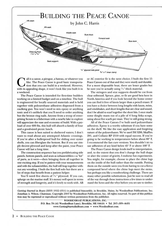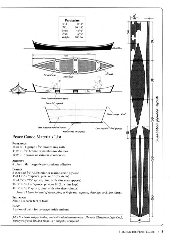 Like many people, Harris had often been disappointed with the results of one-day boatbuilding marathons. "The boats are either ugly or useless - frequently they're both. On the Peace Canoe I aimed for nice lines and some real utility." The boat's elegant shape fits right in with rest of CLC's attractive fleet. And with a payload of more than 600 pounds, it will easily absorb a family of five and a hearty picnic lunch.
