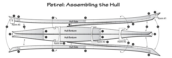 The Petrel SG is the new stitch-and-glue version of the Petrel. It eliminates the fussy strip-planking procedure, which involves cutting and fitting scores of individual cedar strips over a mold. Instead, computer-cut plywood panels for the hull and deck are stitched together with wire, then reinforced with epoxy and fiberglass. The simplified plywood hull has its own sculptural qualities and loses none of the performance of the original.