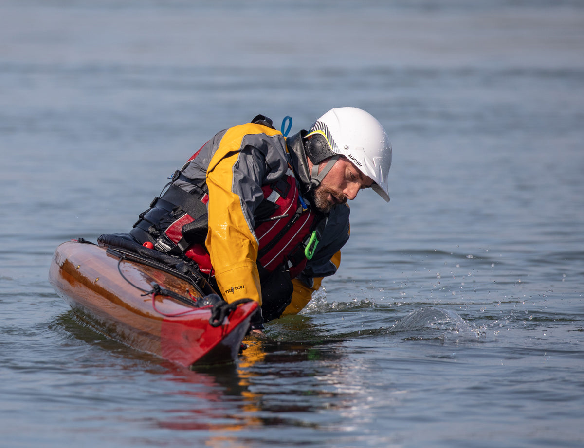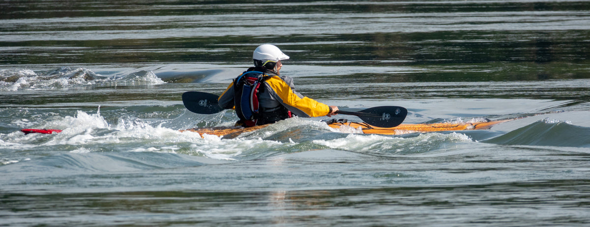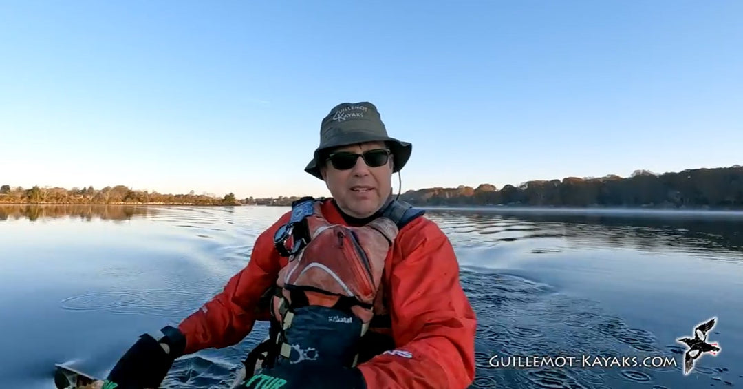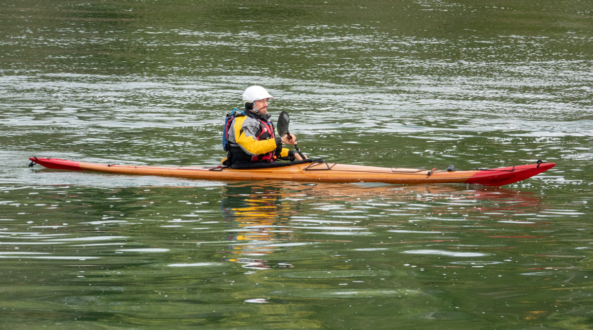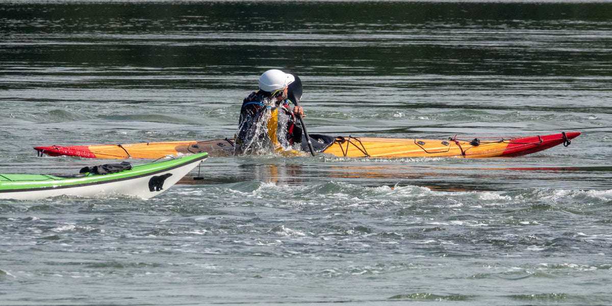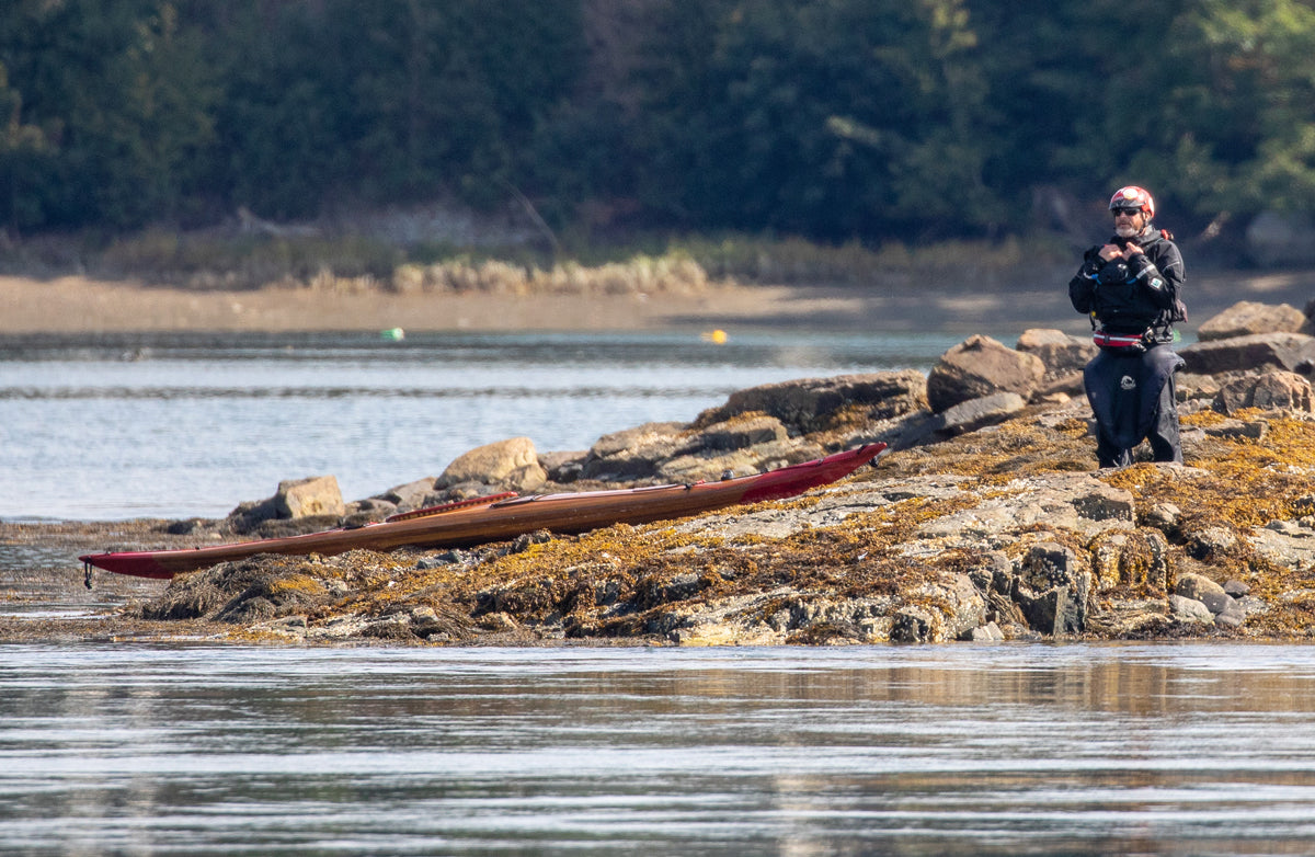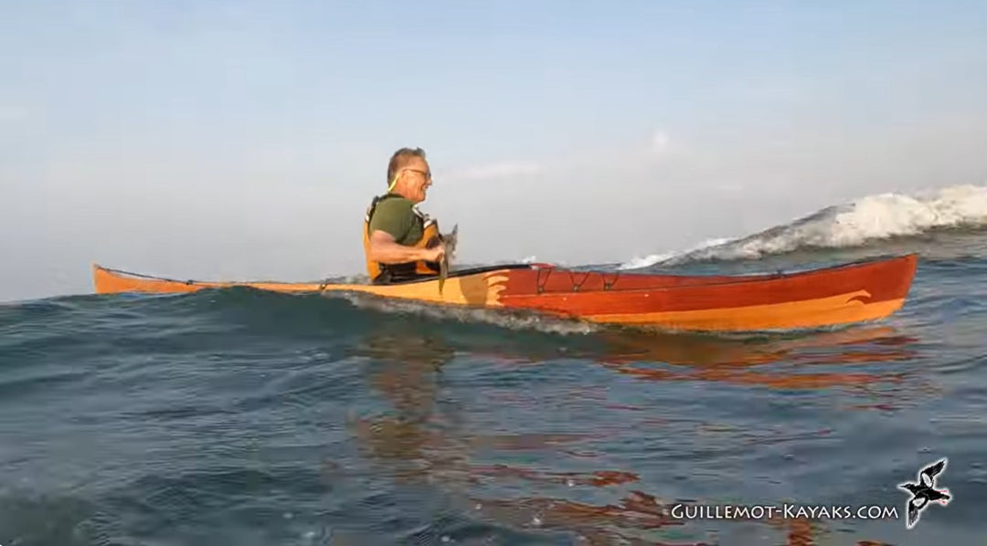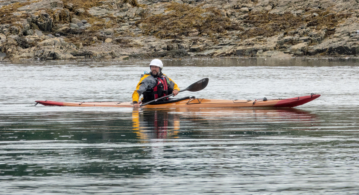 Guillemot Play strip-planked kayak being paddled during the Schoodic Sea-Kayak Retreat in Maine in 2021.