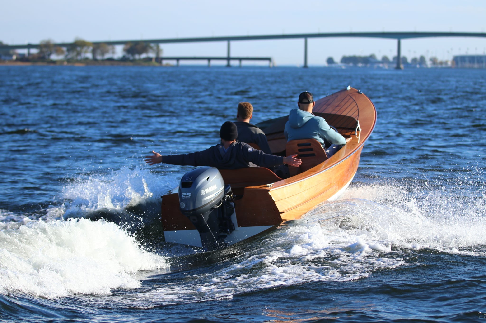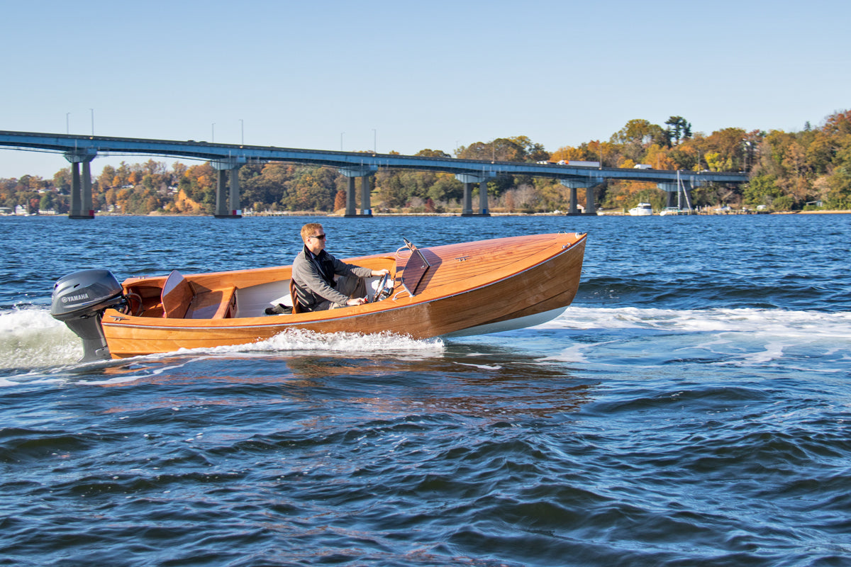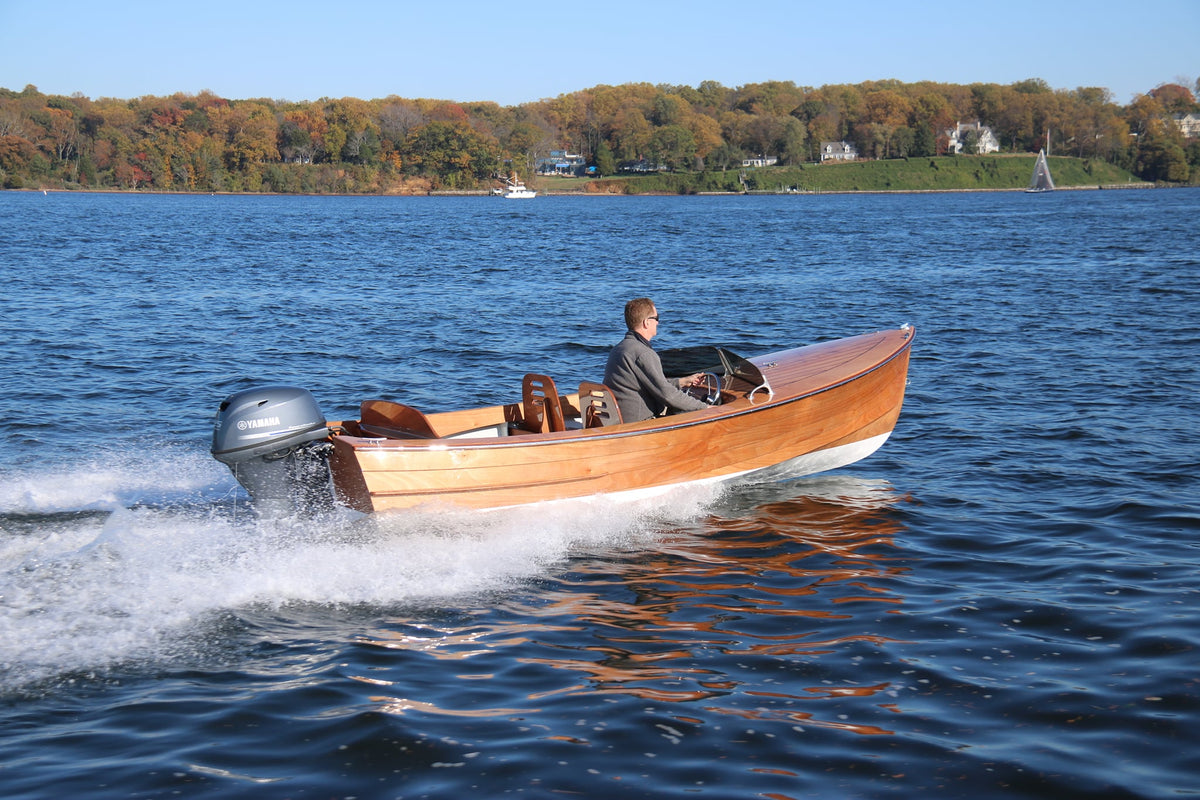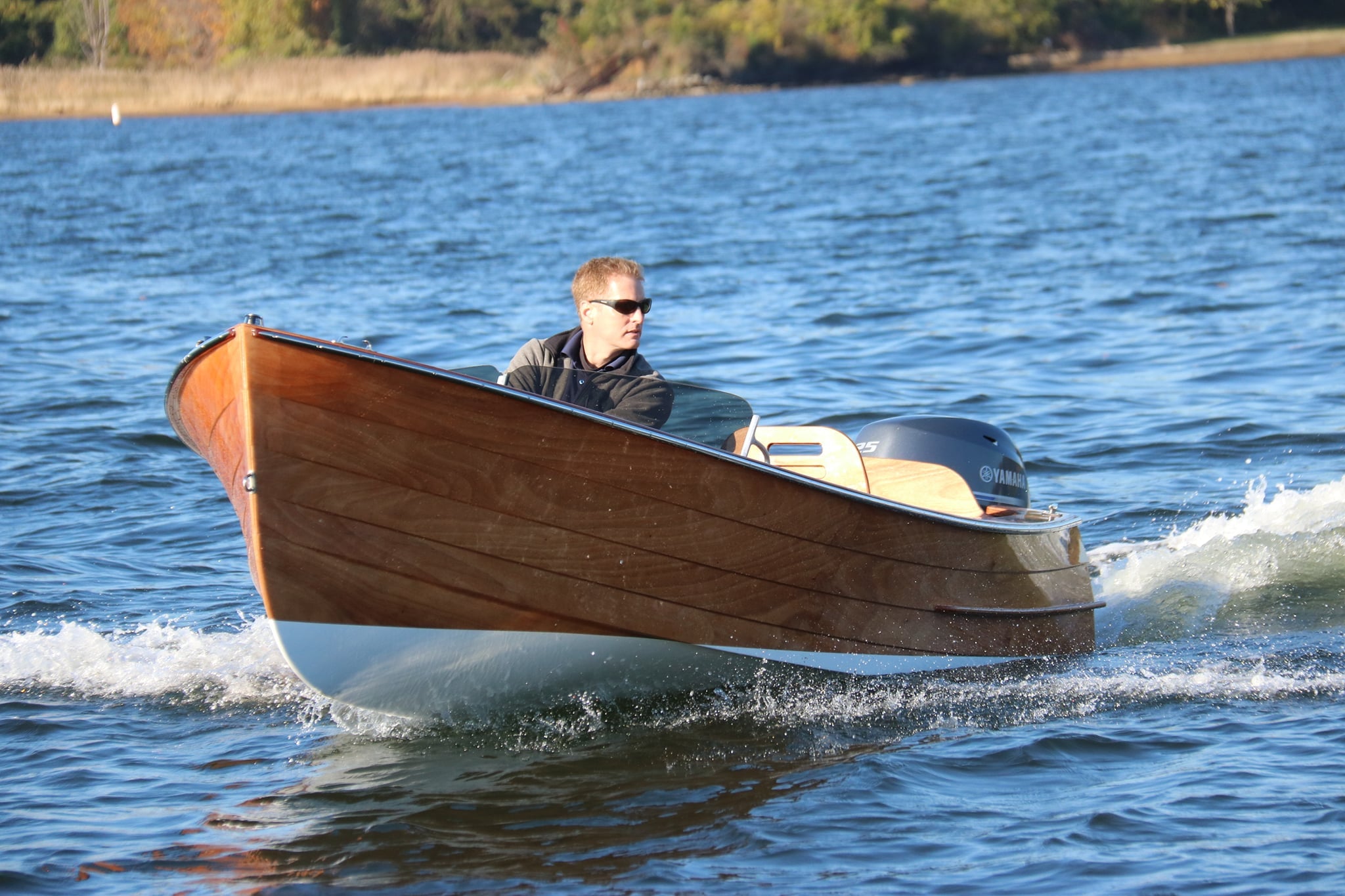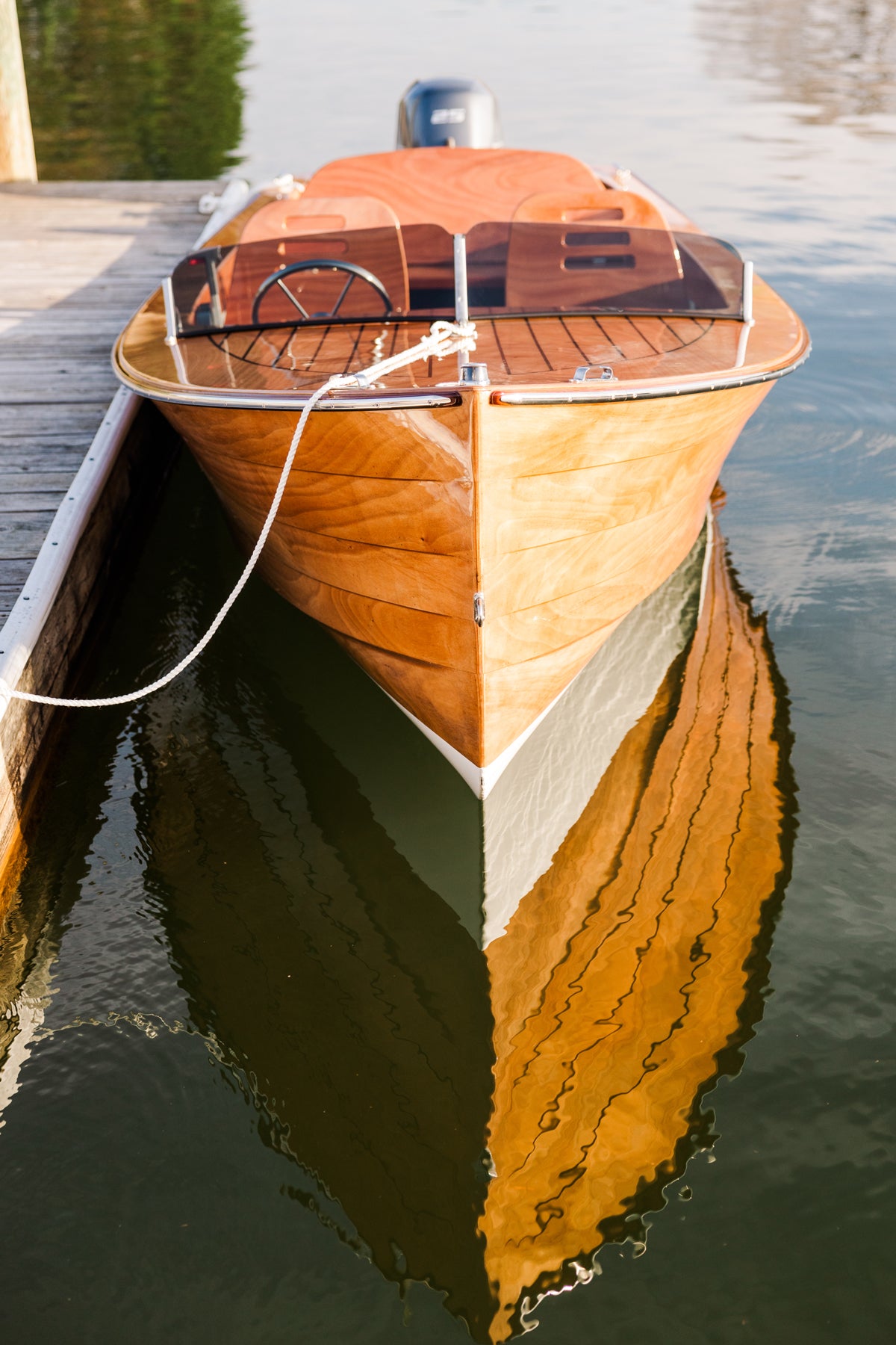 In trials we saw 24 mph, just under 21 knots, with a 25-hp motor. The boat doesn't skid in turns, is well behaved in general, and is not much slowed by a crew of three adults. The deep sheer line in unusual in a retro runabout. She appears to have a Norwegian heritage at idle speed; her bow evoke the traditional snekke design.