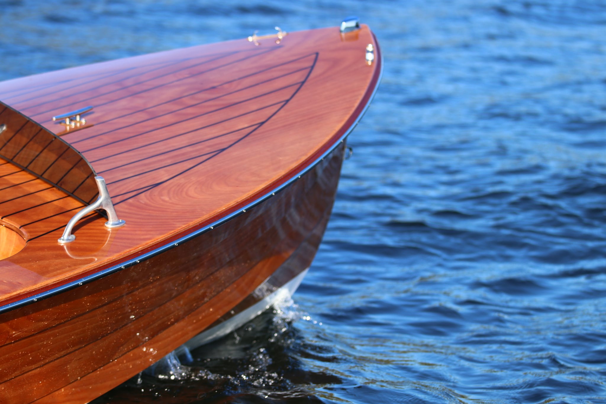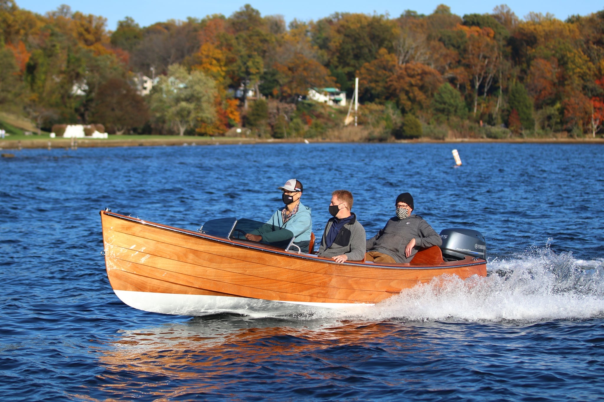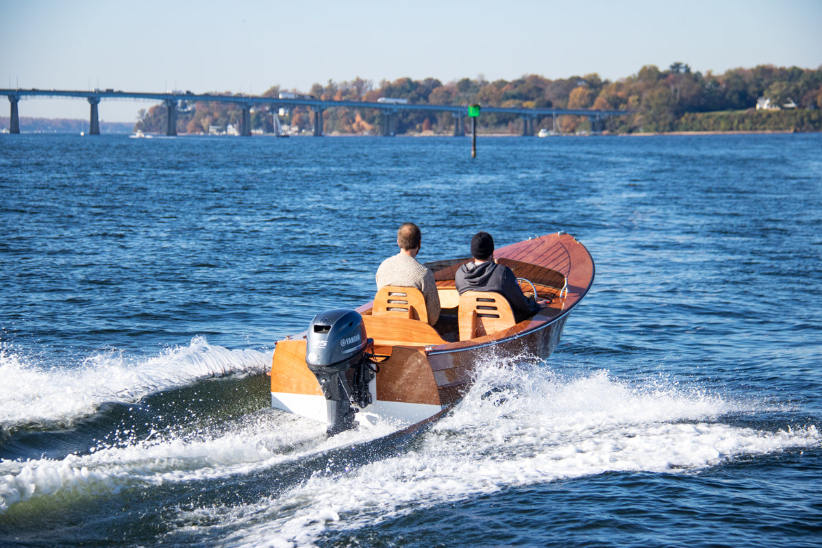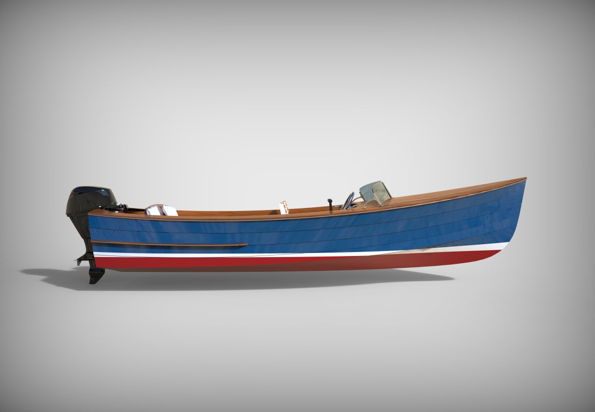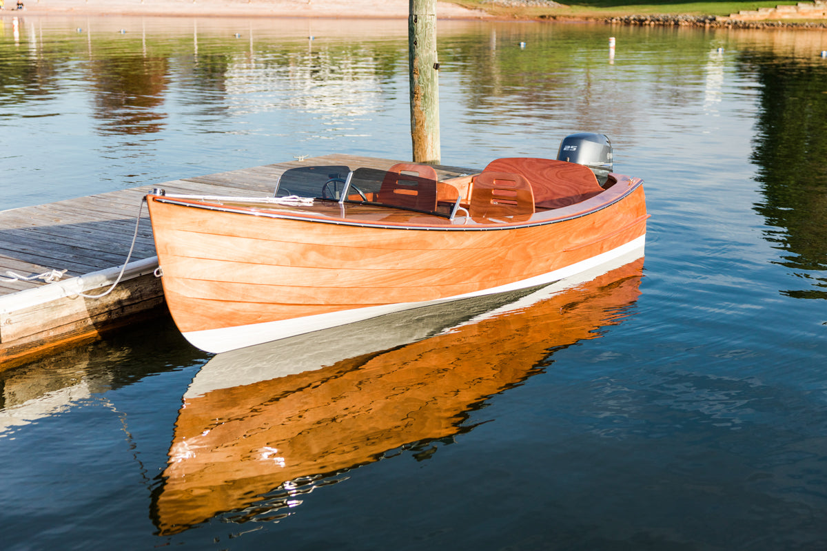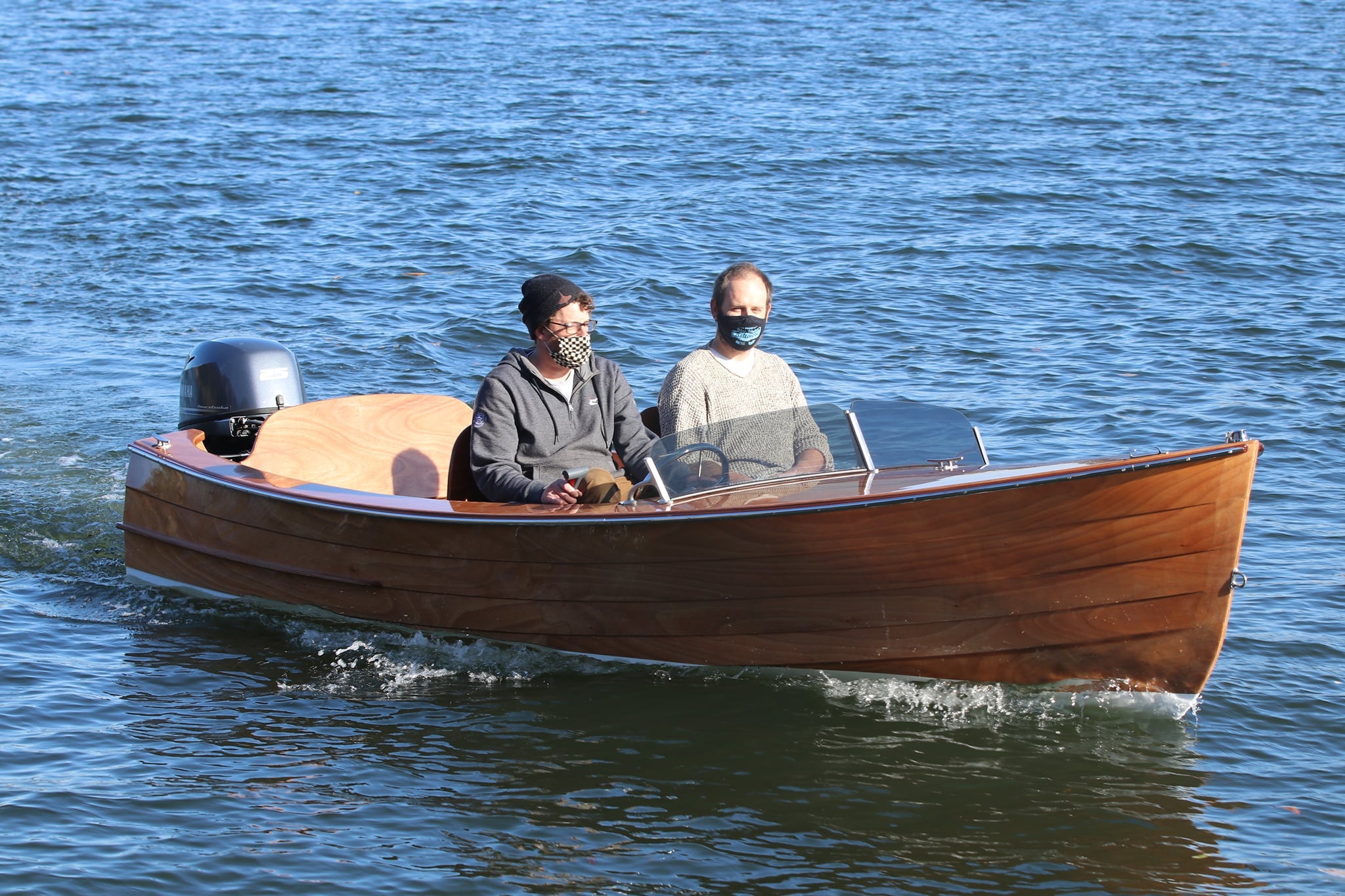 In trials we saw 24 mph, just under 21 knots, with a 25-hp motor. The boat doesn't skid in turns, is well behaved in general, and is not much slowed by a crew of three adults. The deep sheer line in unusual in a retro runabout. She appears to have a Norwegian heritage at idle speed; her bow evoke the traditional snekke design.
