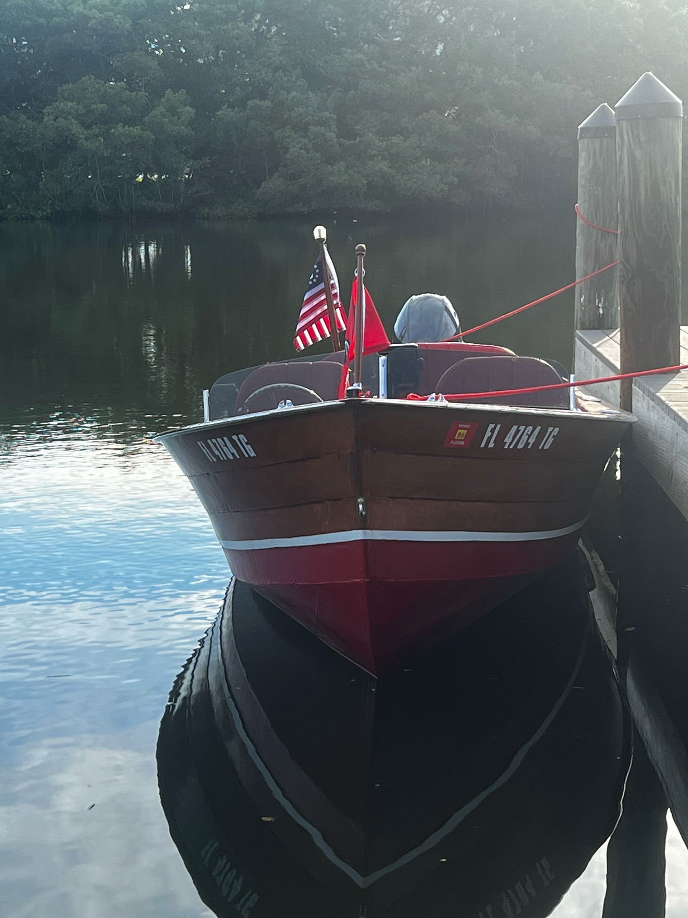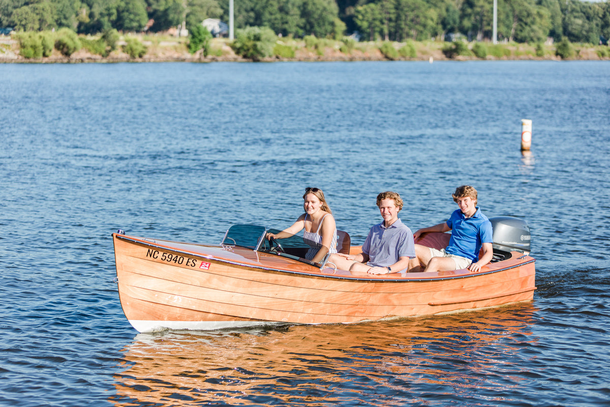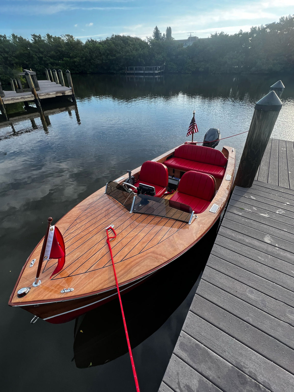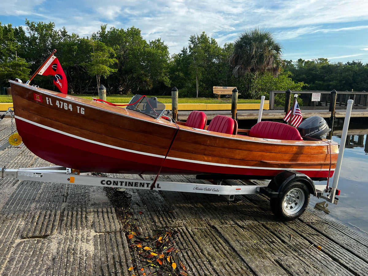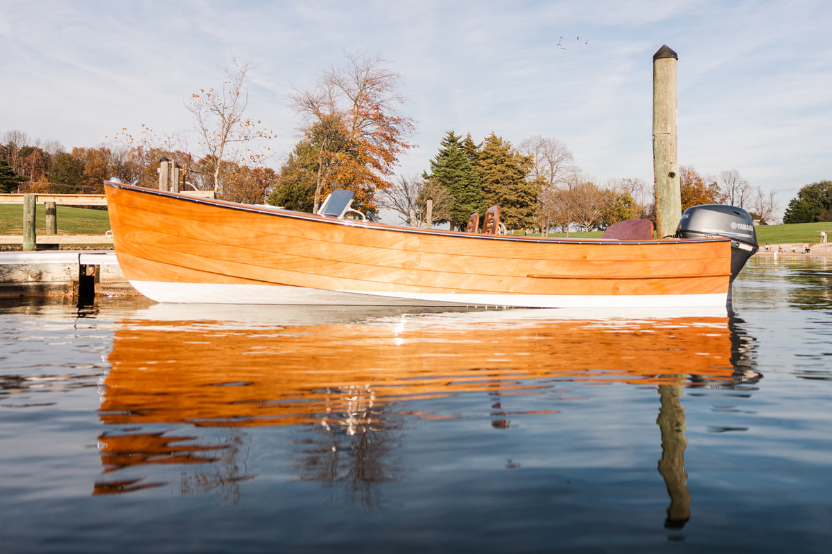 In trials we saw 24 mph, just under 21 knots, with a 25-hp motor. The boat doesn't skid in turns, is well behaved in general, and is not much slowed by a crew of three adults. The deep sheer line in unusual in a retro runabout. She appears to have a Norwegian heritage at idle speed; her bow evoke the traditional snekke design.