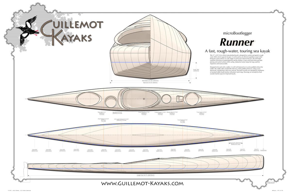 Nick writes that the Runner "is designed for comfort and speed in rough water. With a lot of capacity for gear, it can be used as an efficient expedition vessel while being a fast and fun day tripper. It will excel at downwind runs. The full-length waterline maximizes its speed potential, and the shallow-V stern with hard chines provides planing and control surfaces while surfing. Substantial rocker keeps the long waterline responsive and maneuverable."