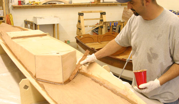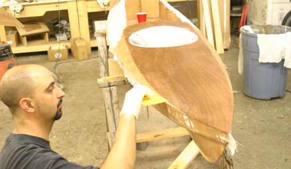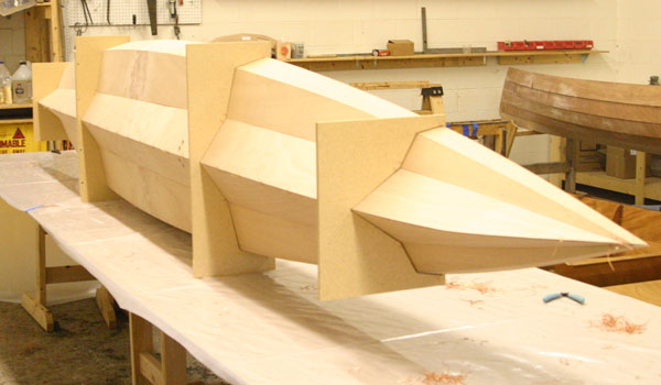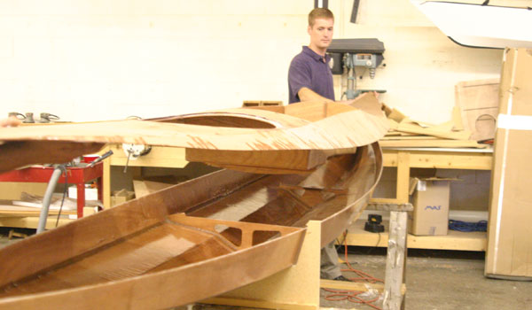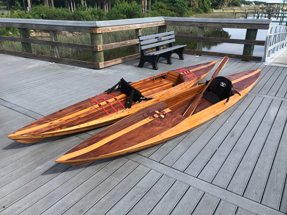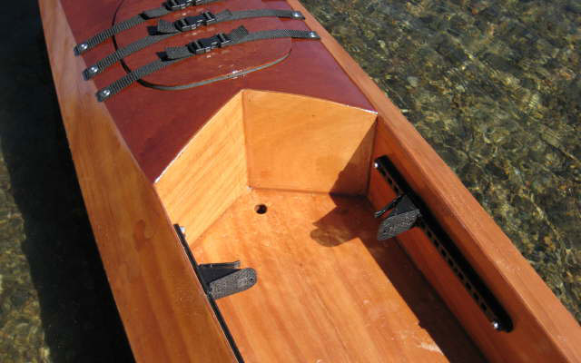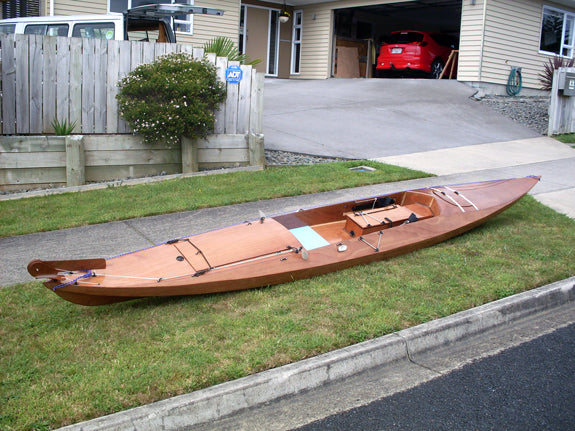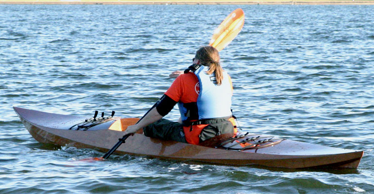 The Sea Island Sport is 15'6" long and features a pleasing shape, attractive from every angle, with a unique contrasting deck made out of Sapele plywood. The reddish Sapele contrasts with the more honey-colored BS 1088 Okoume used for the hull. Sharp-eyed observers will note a similarity to the Shearwater kayaks, which have a similar cambered Sapele deck and tumbled-home sides.