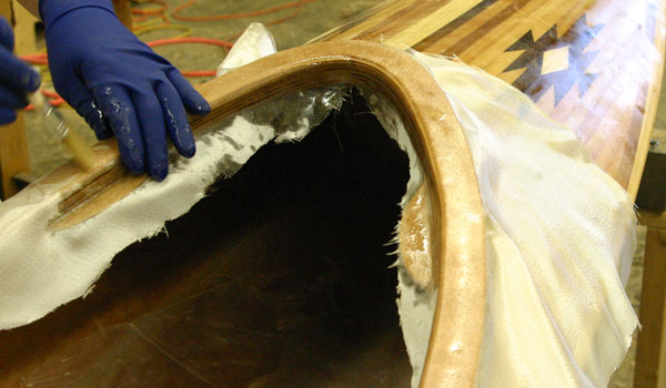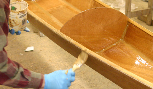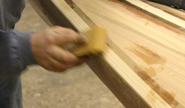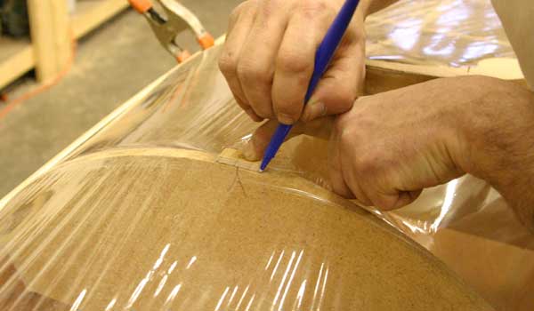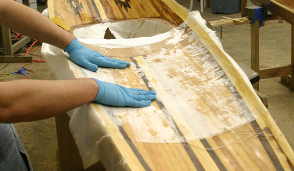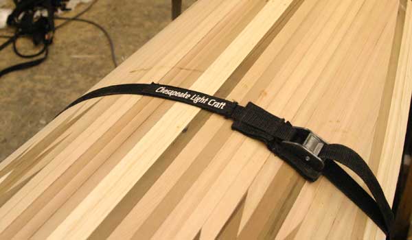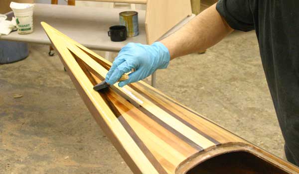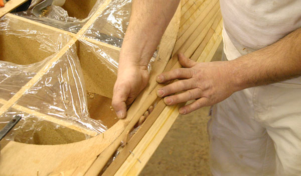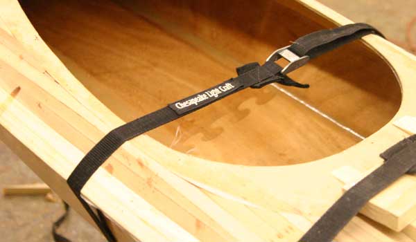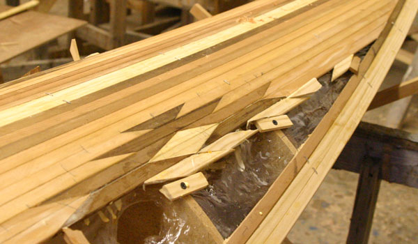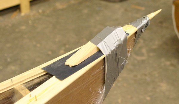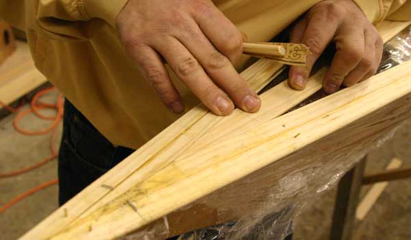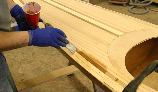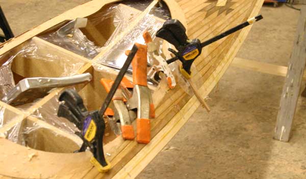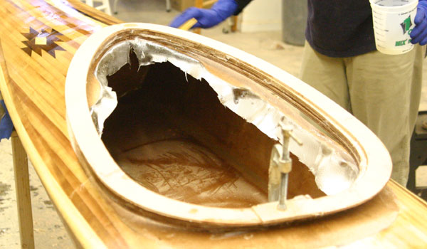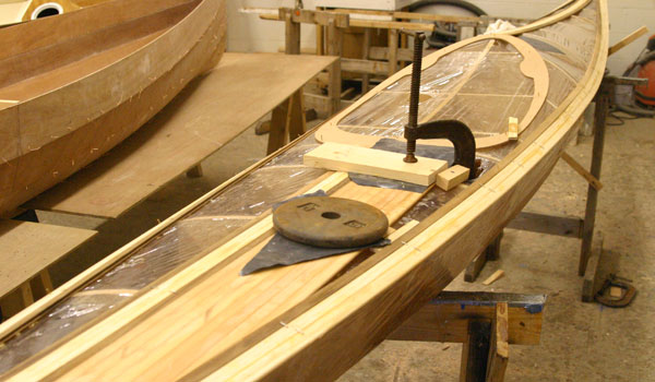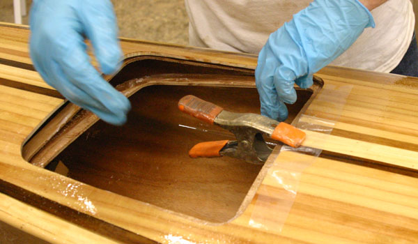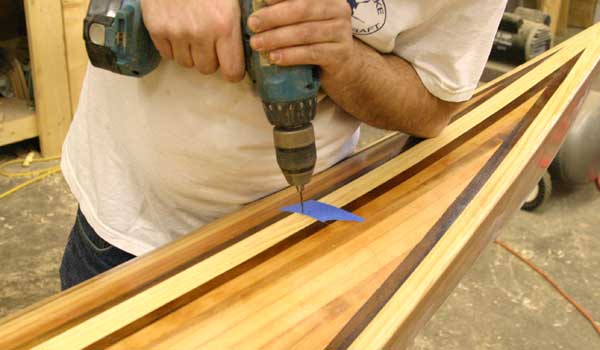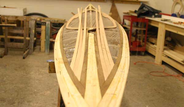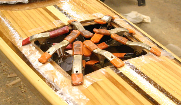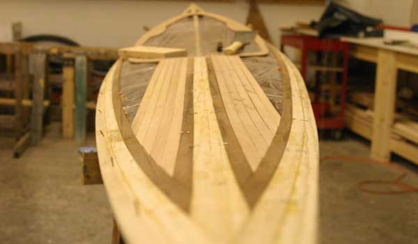 Once the deck pattern has been established and glued together, the entire deck is gently taken off the hull and the underside fiberglassed. The molds are removed from the hull, then the deck is epoxied back in place, atop structural “sheer clamps.” Finally, the top of the strip deck is fiberglassed and the cockpit and hatches are added.
