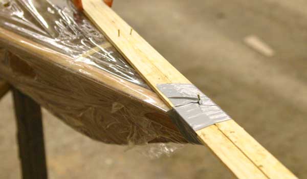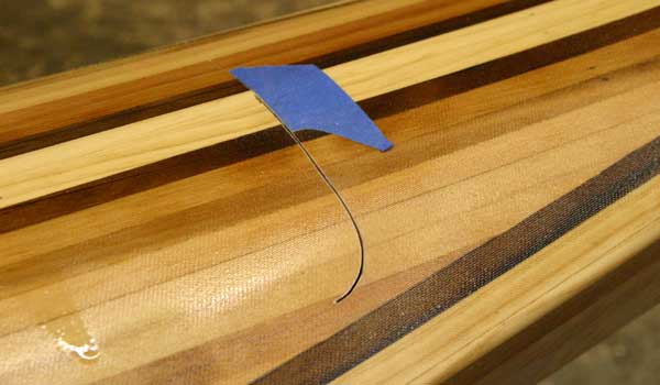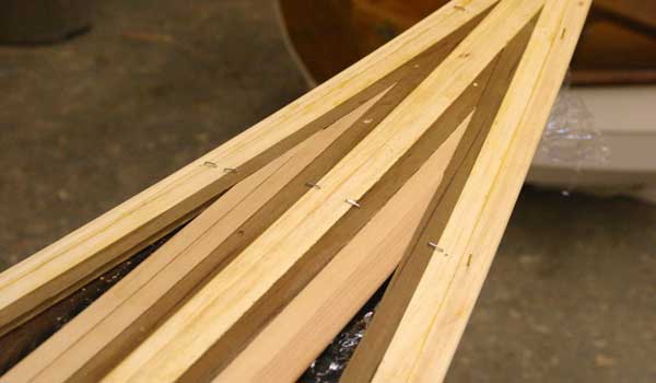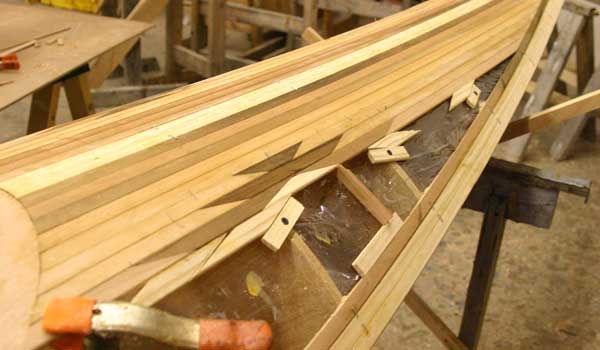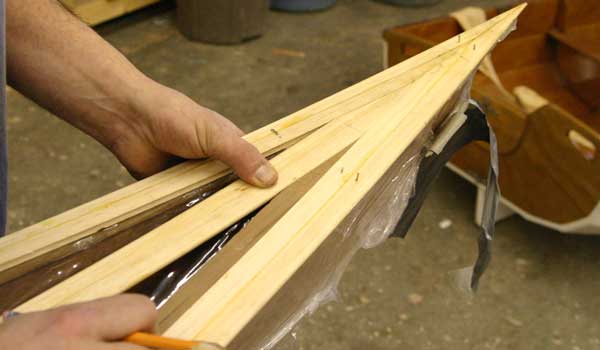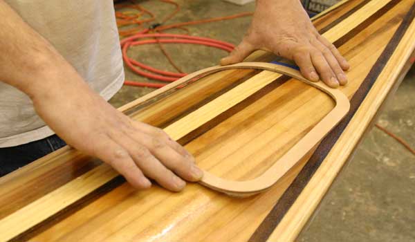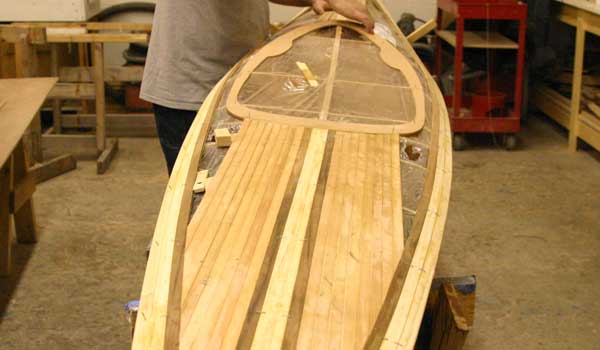 Once the deck pattern has been established and glued together, the entire deck is gently taken off the hull and the underside fiberglassed. The molds are removed from the hull, then the deck epoxied back in place, atop structural “sheer clamps.” Finally, the top of the strip deck is fiberglassed and the cockpit and hatches are added.