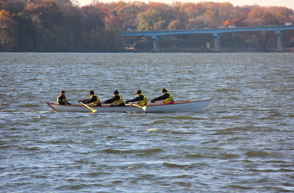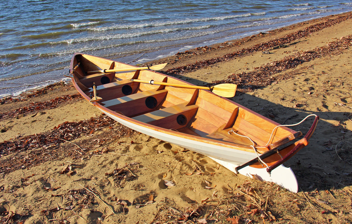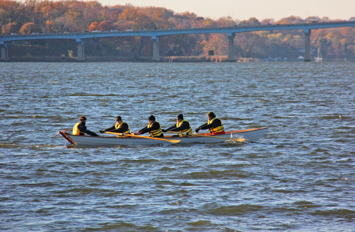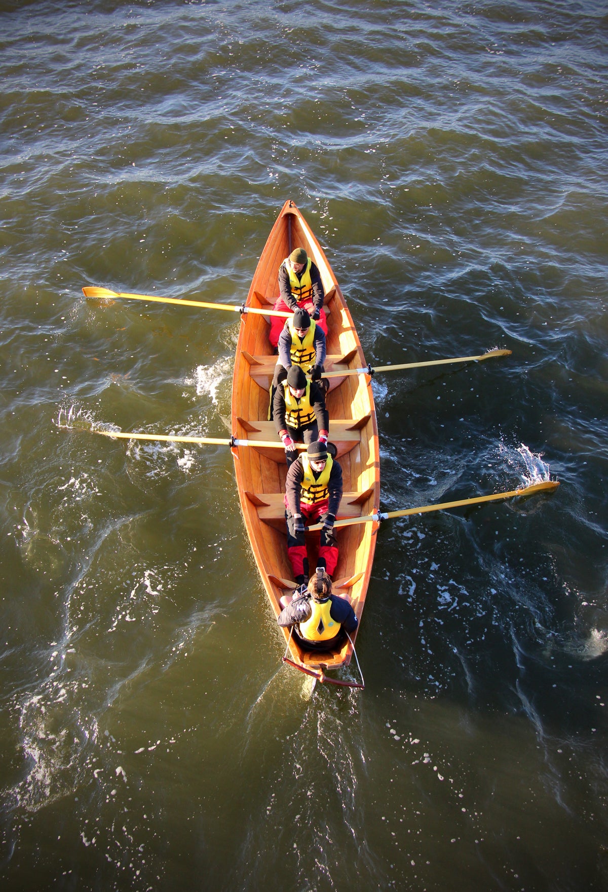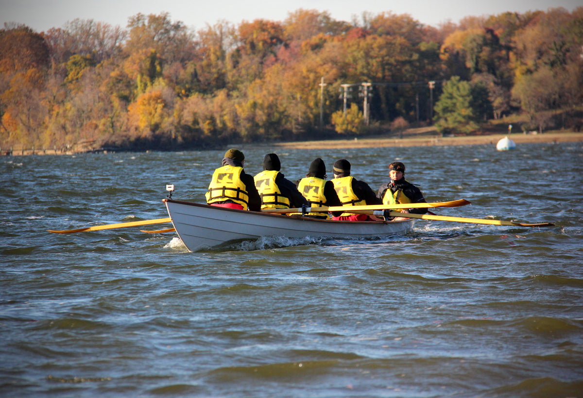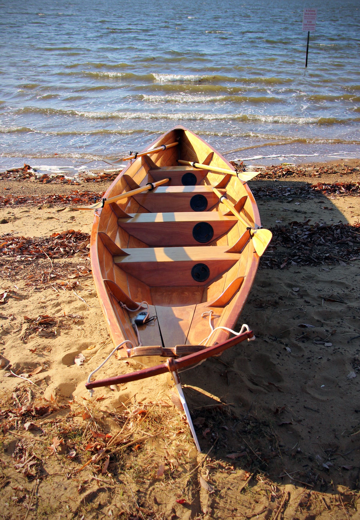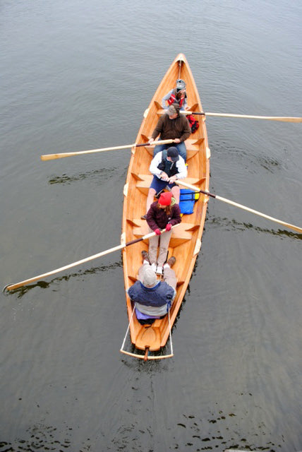 There are four sweeps, plus room astern for a coxswain. As you can see in the video, the boat is fast and stable. The interior layout allows a very wide range of crew weight and height, fitting rowers from about 5'6" to 6'6" tall. Integral flotation chambers allow the boat to be recovered and bailed unassisted, but from all the testing the boat seems to have excellent manners in waves and is a good match for expected currents and waves on rivers, bays, and alongshore.