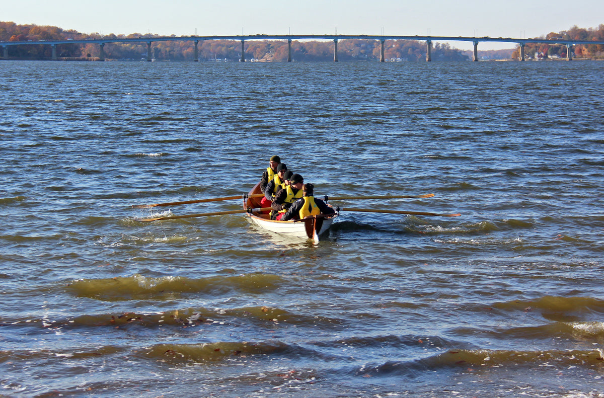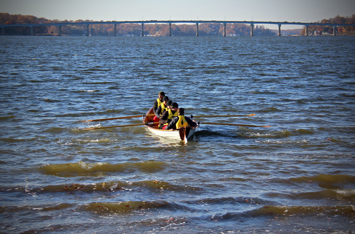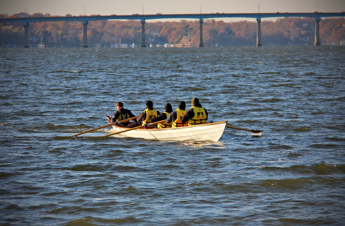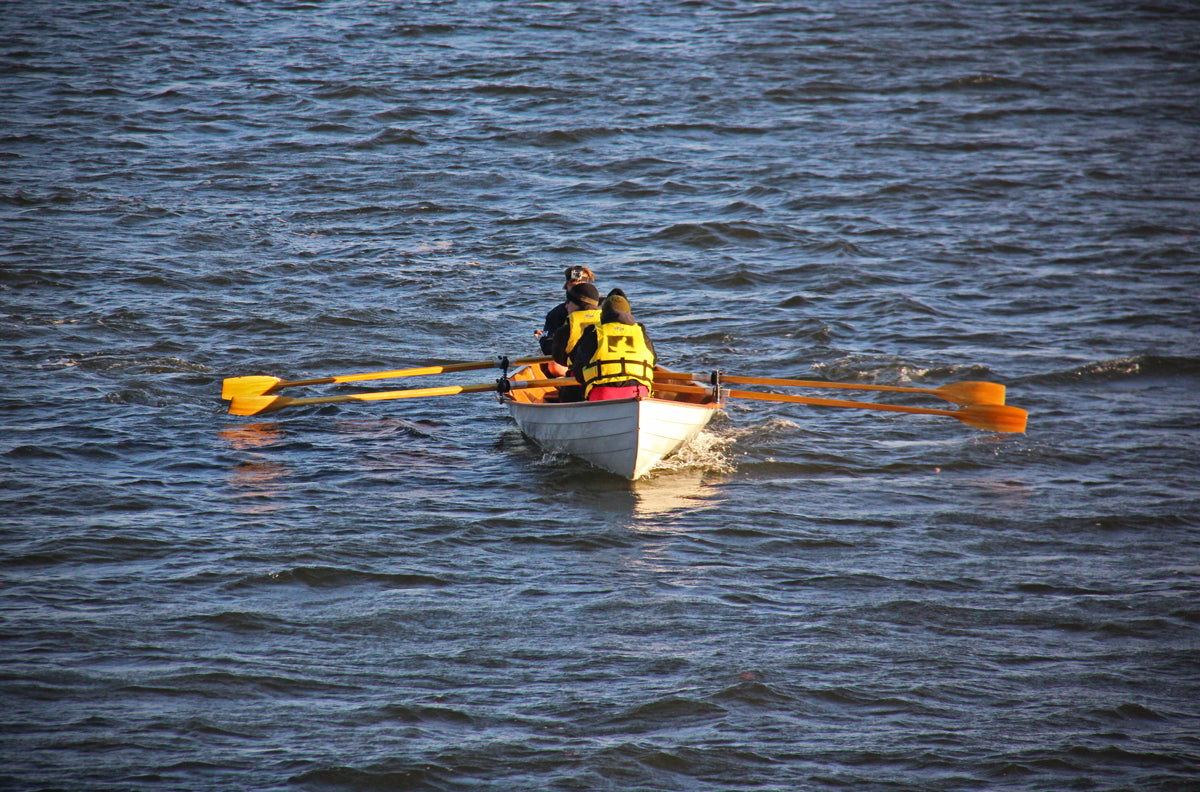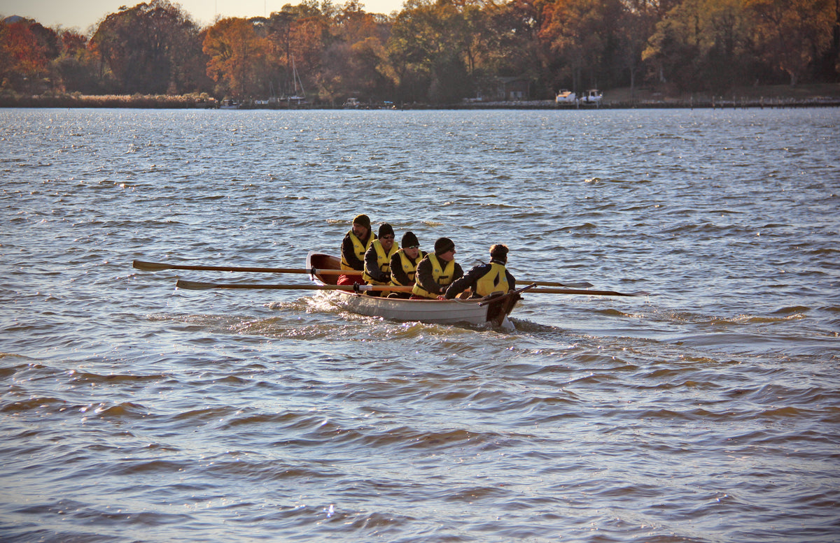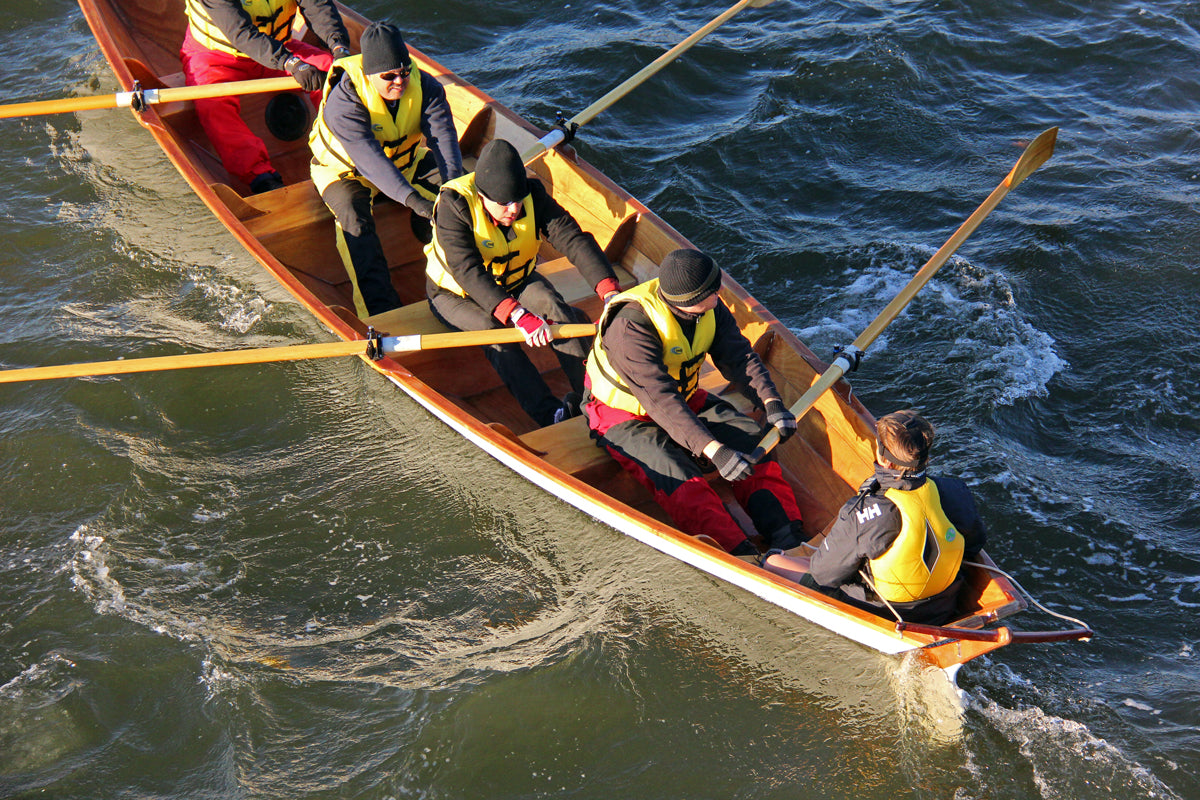 There are four sweeps, plus room astern for a coxswain. As you can see in the video, the boat is fast and stable. The interior layout allows a very wide range of crew weight and height, fitting rowers from about 5'6" to 6'6" tall. Integral flotation chambers allow the boat to be recovered and bailed unassisted, but from all the testing the boat seems to have excellent manners in waves and is a good match for expected currents and waves on rivers, bays, and alongshore.