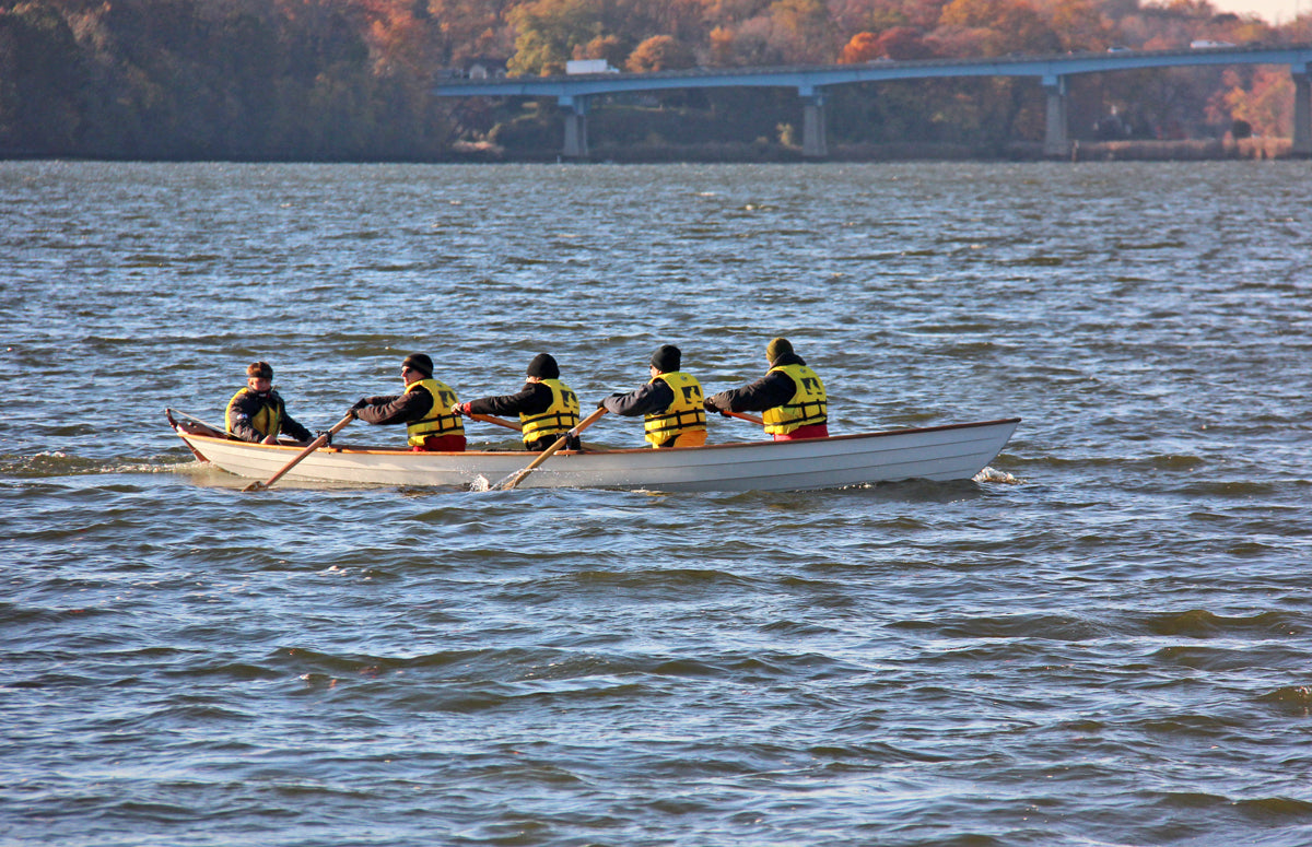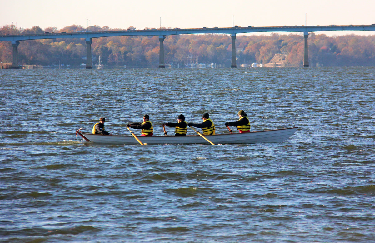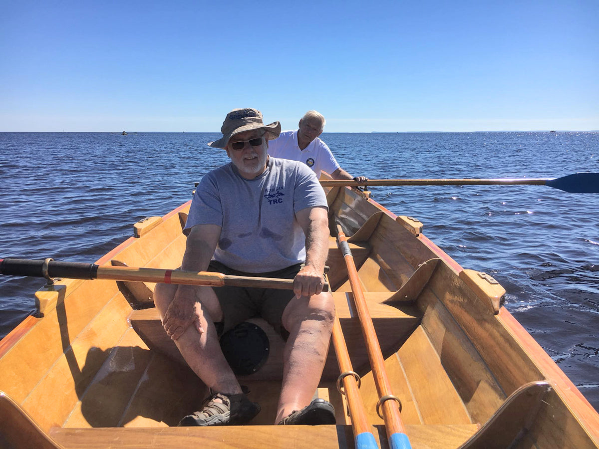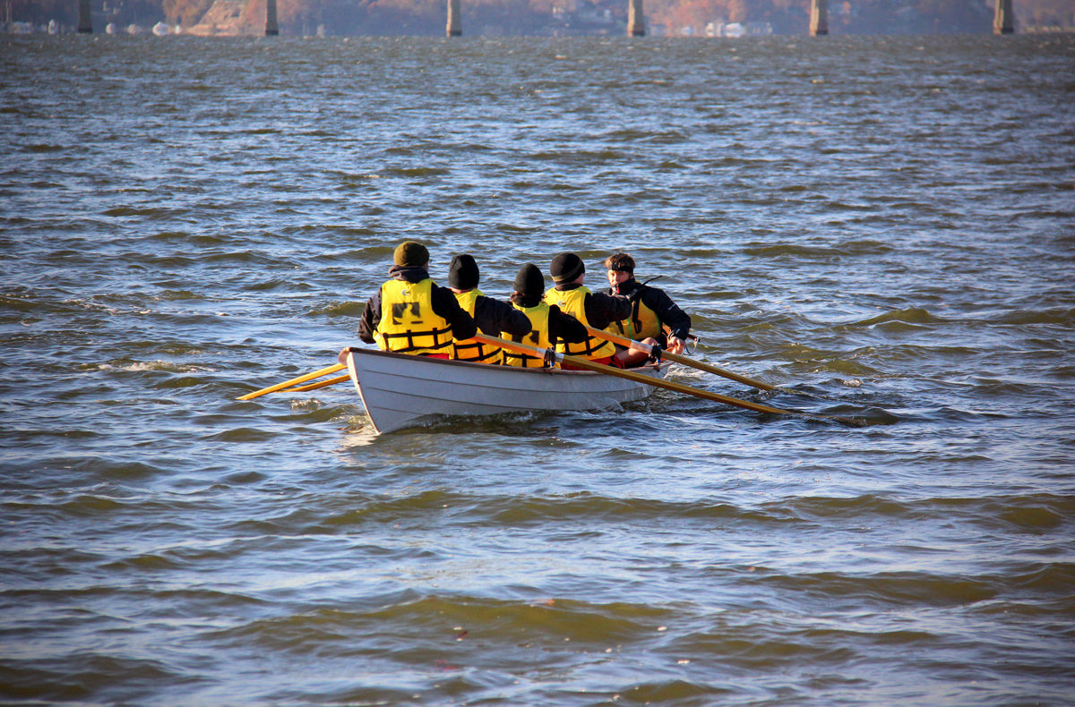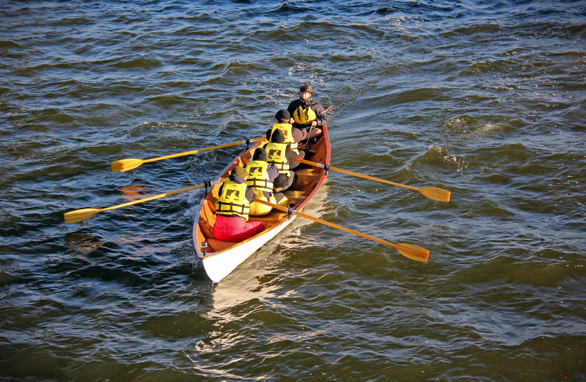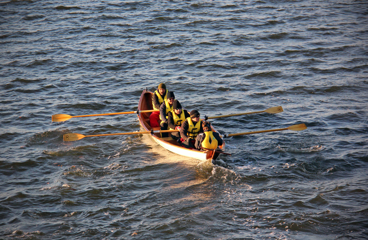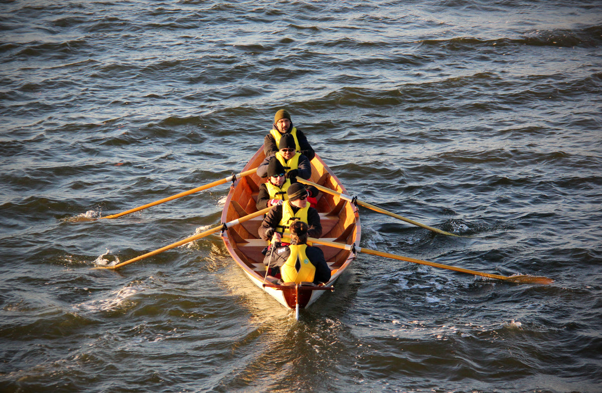 There are four sweeps, plus room astern for a coxswain. As you can see in the video, the boat is fast and stable. The interior layout allows a very wide range of crew weight and height, fitting rowers from about 5'6" to 6'6" tall. Integral flotation chambers allow the boat to be recovered and bailed unassisted, but from all the testing the boat seems to have excellent manners in waves and is a good match for expected currents and waves on rivers, bays, and alongshore.