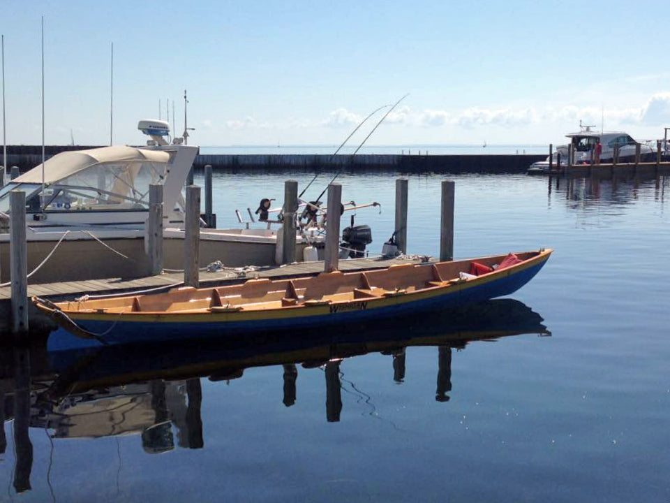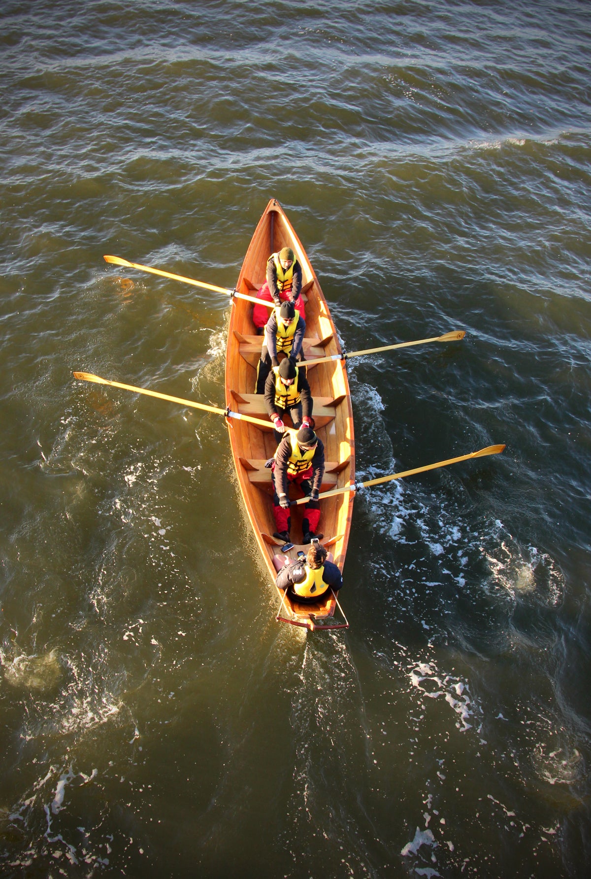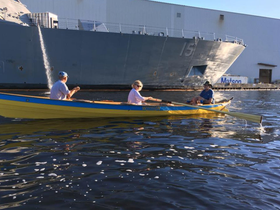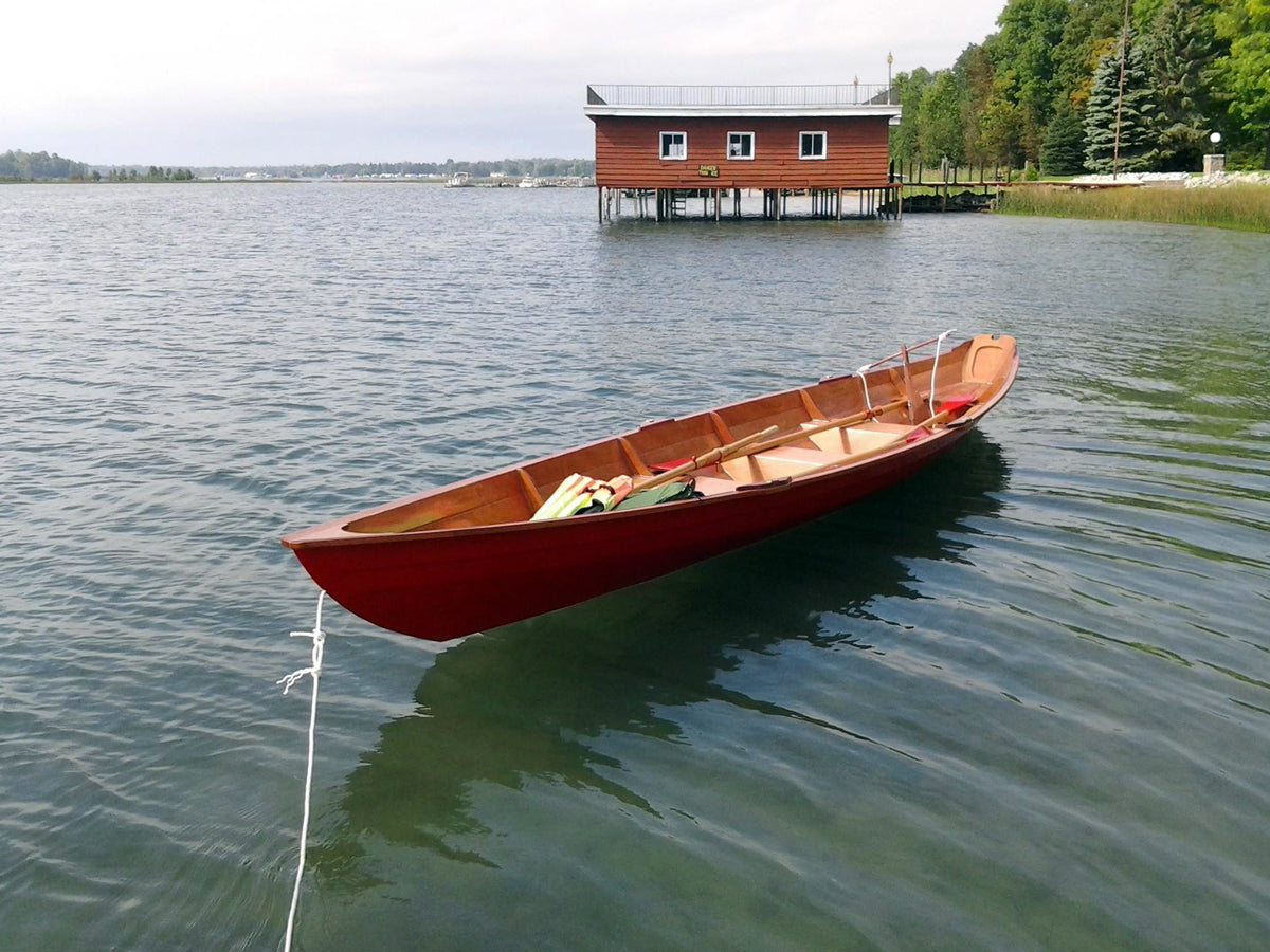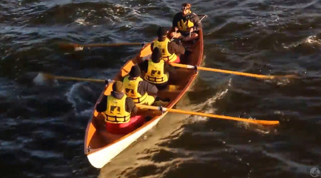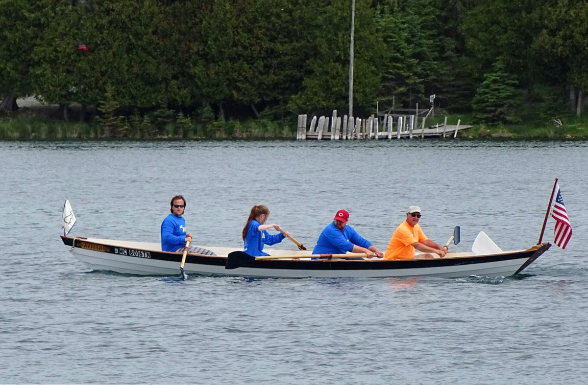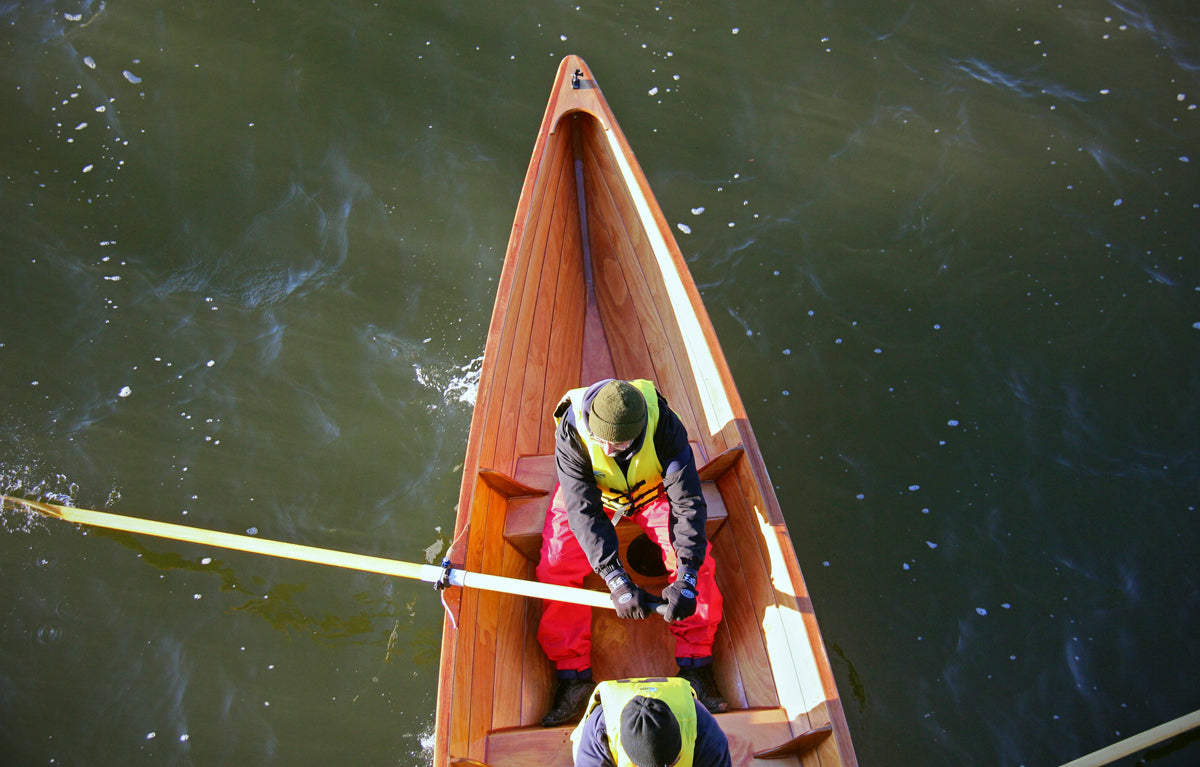 There are four sweeps, plus room astern for a coxswain. As you can see in the video, the boat is fast and stable. The interior layout allows a very wide range of crew weight and height, fitting rowers from about 5'6" to 6'6" tall. Integral flotation chambers allow the boat to be recovered and bailed unassisted, but from all the testing the boat seems to have excellent manners in waves and is a good match for expected currents and waves on rivers, bays, and alongshore.