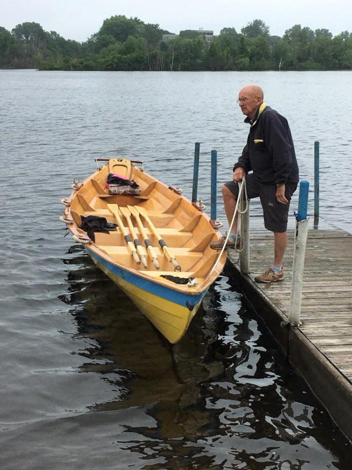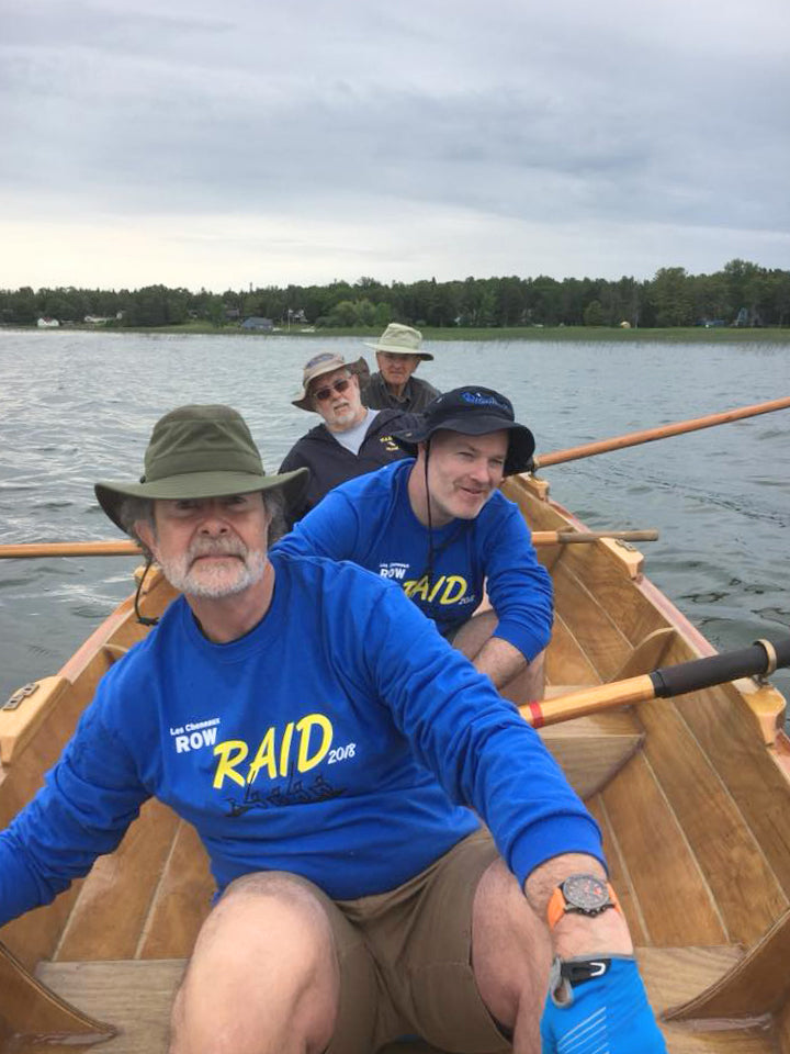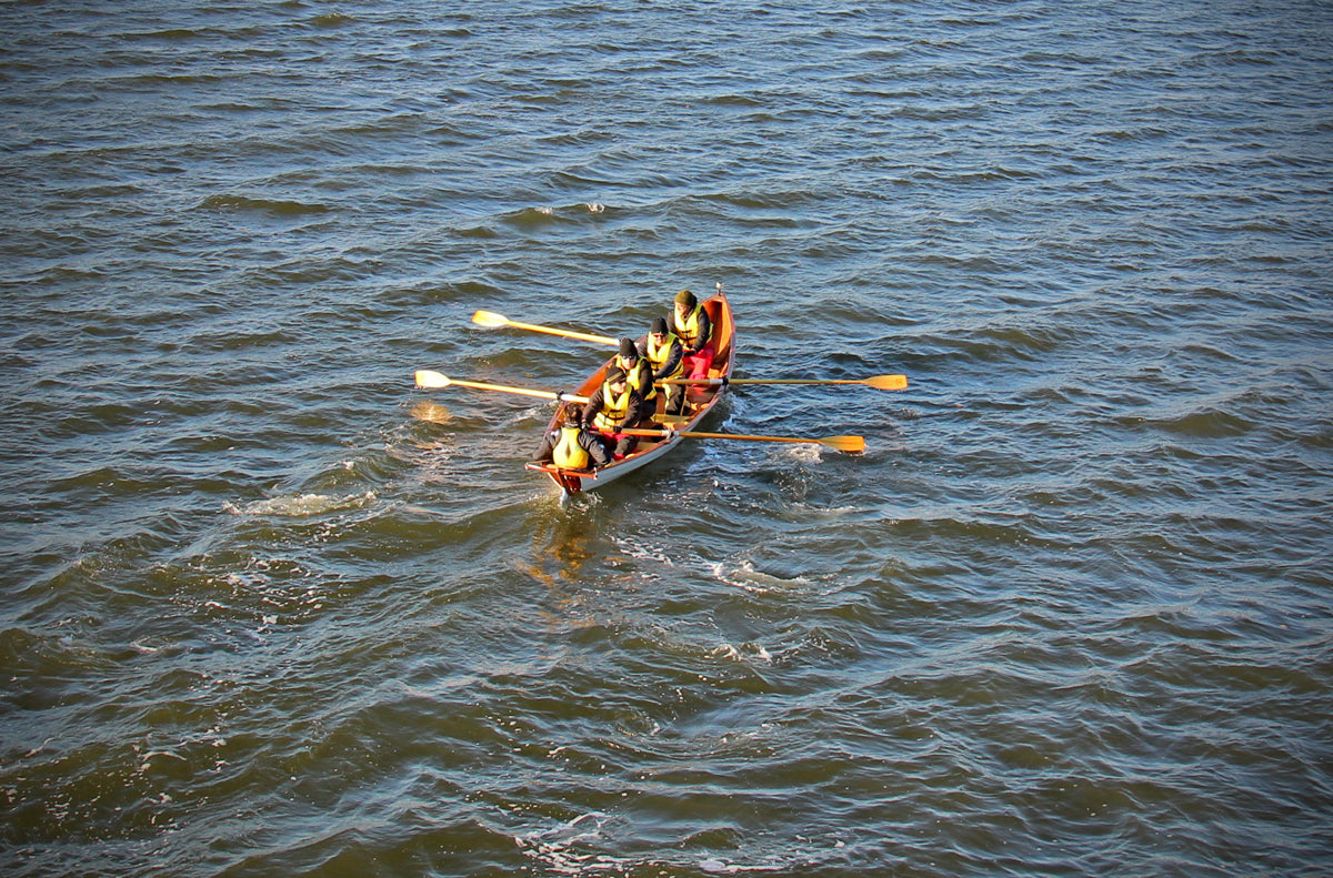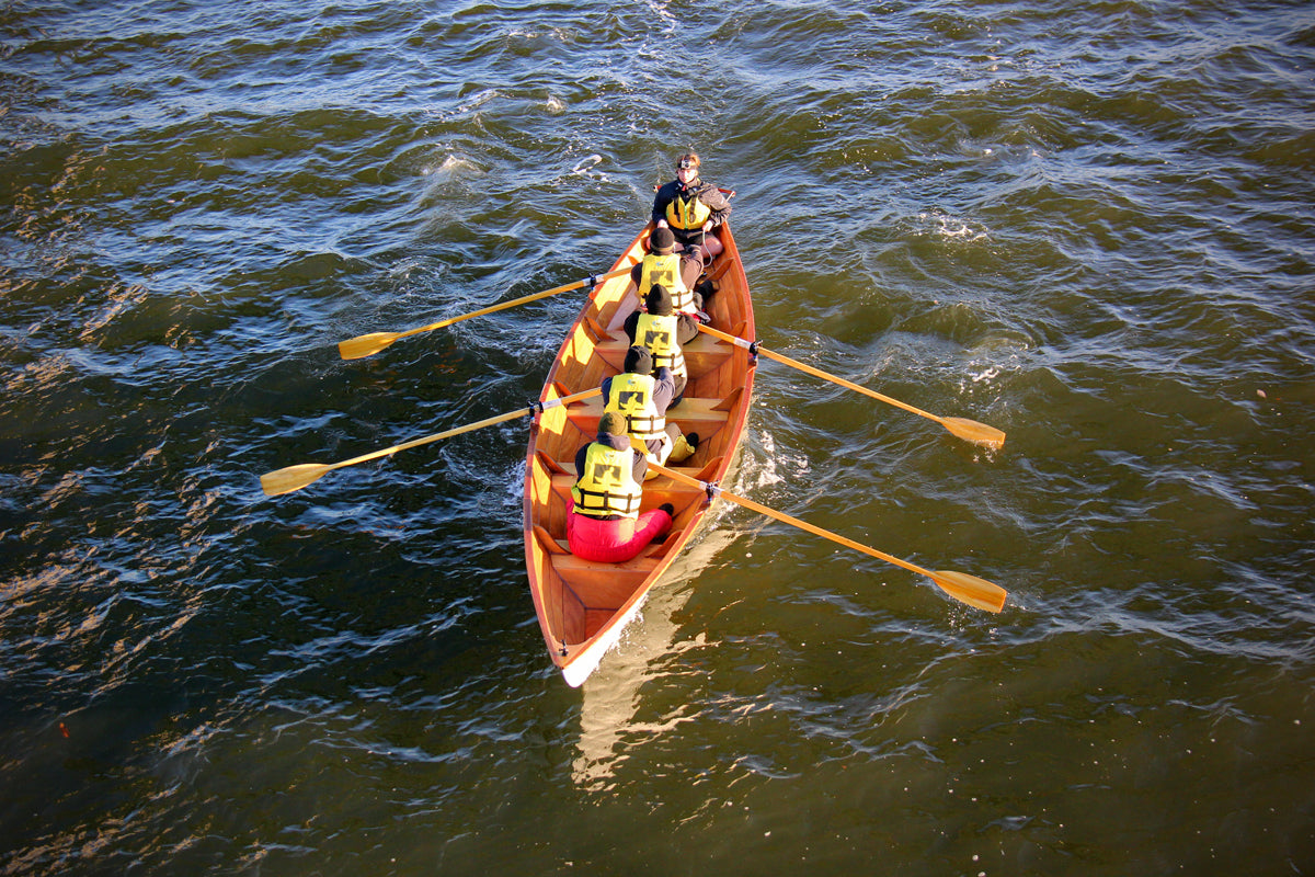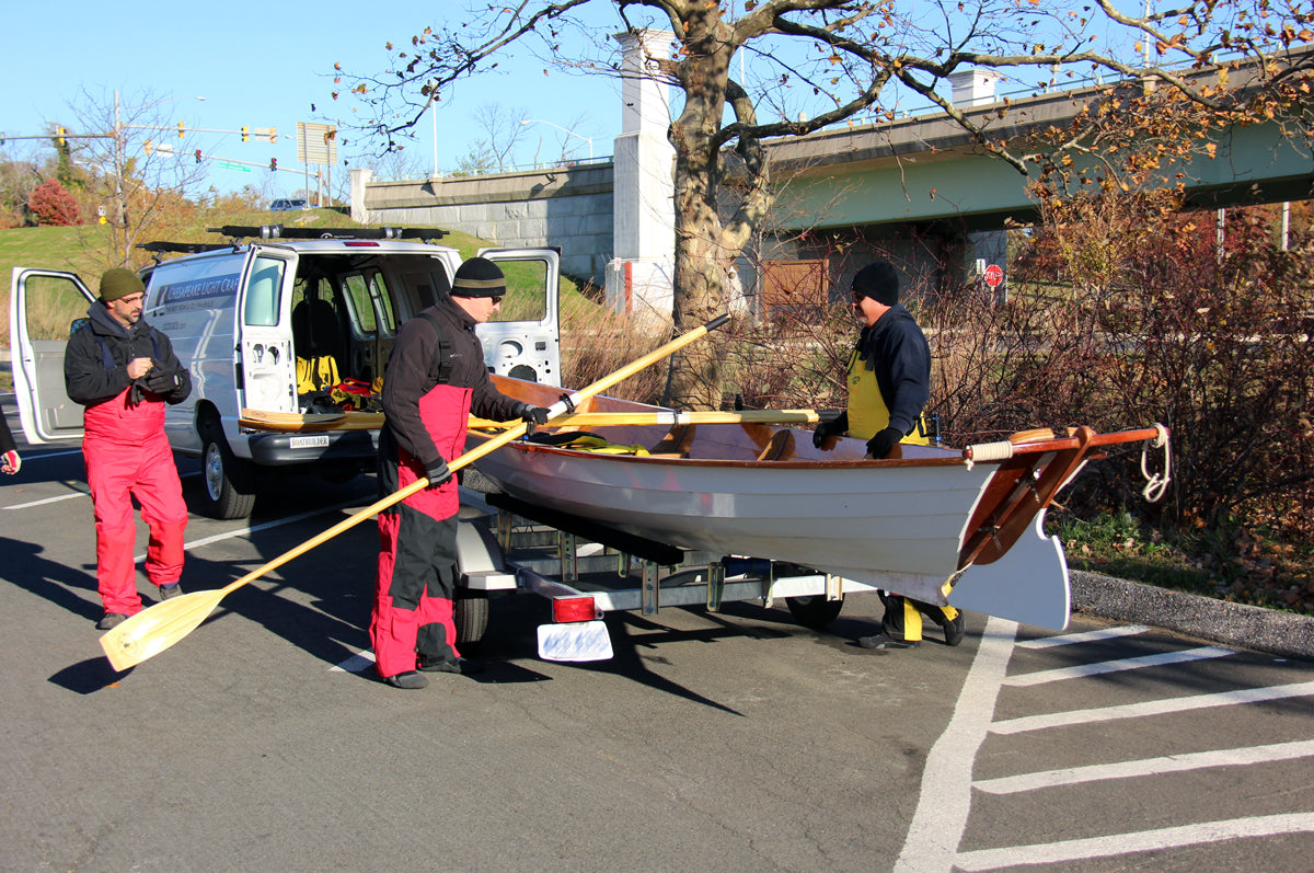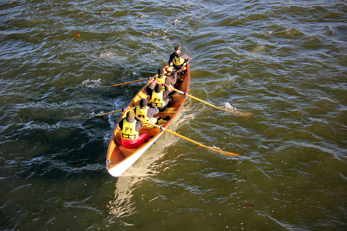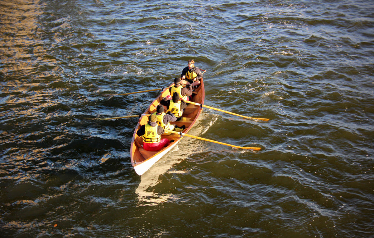 There are four sweeps, plus room astern for a coxswain. As you can see in the video, the boat is fast and stable. The interior layout allows a very wide range of crew weight and height, fitting rowers from about 5'6" to 6'6" tall. Integral flotation chambers allow the boat to be recovered and bailed unassisted, but from all the testing the boat seems to have excellent manners in waves and is a good match for expected currents and waves on rivers, bays, and alongshore.
