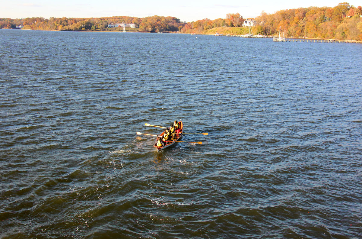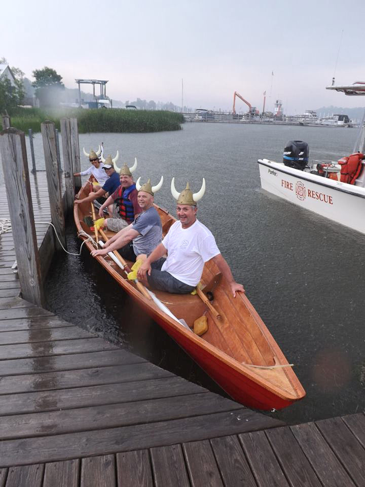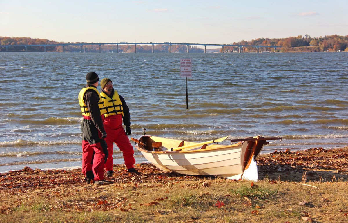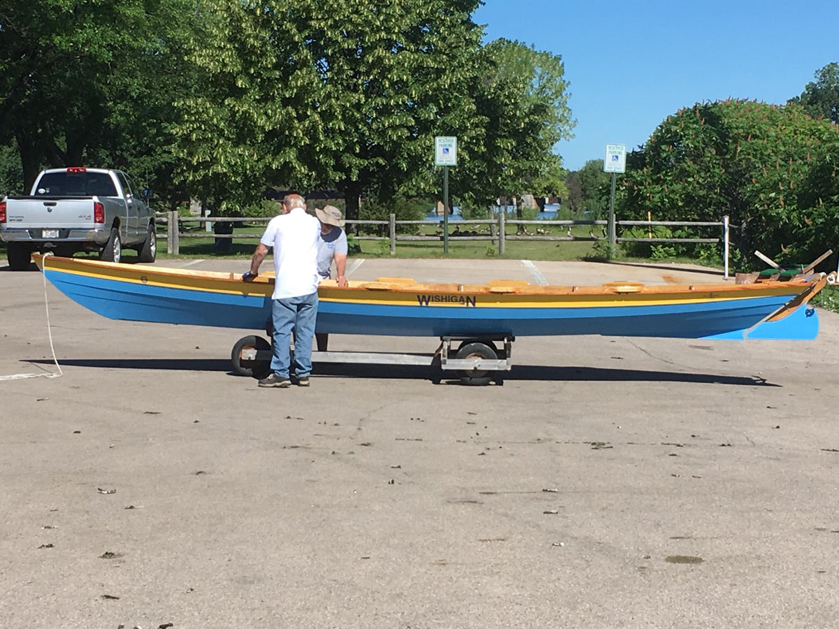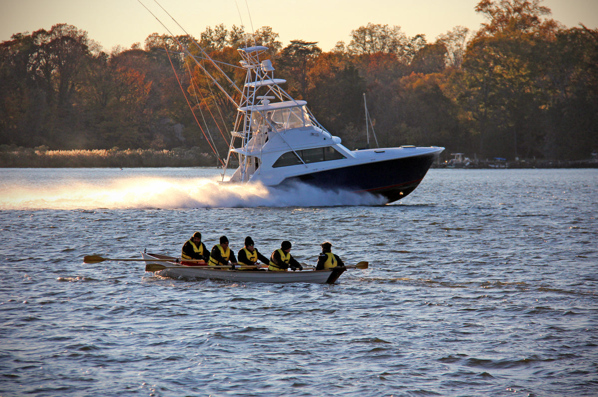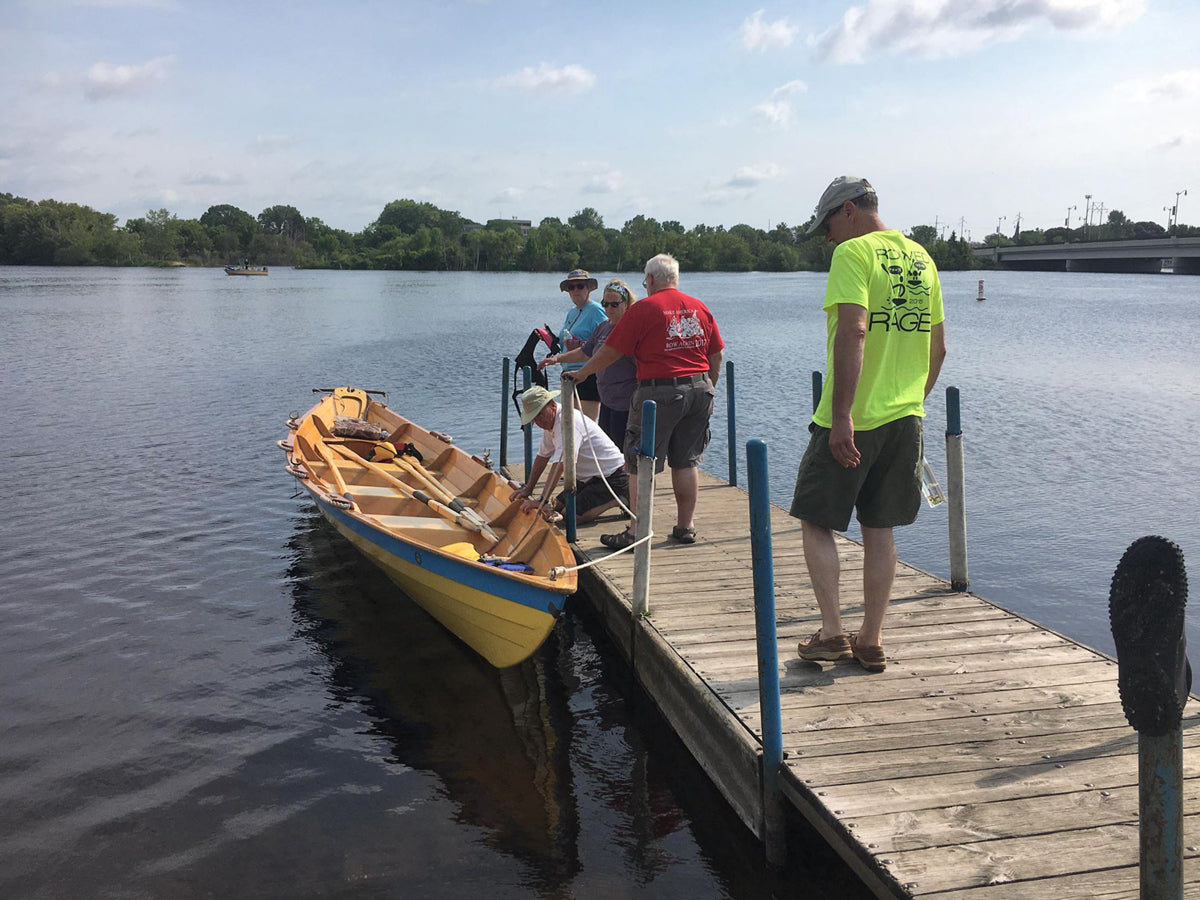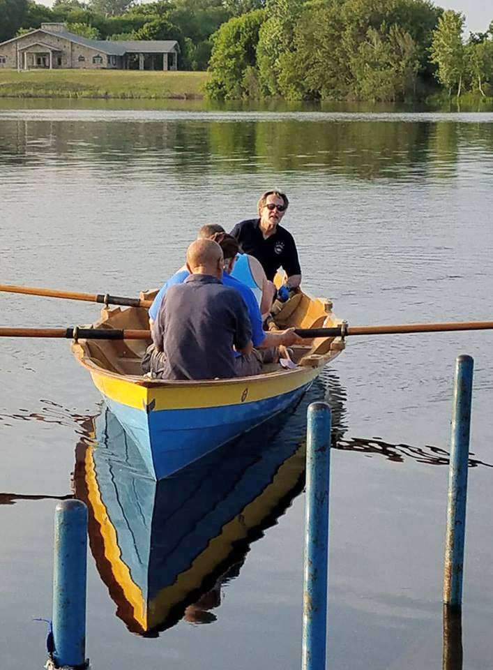 There are four sweeps, plus room astern for a coxswain. As you can see in the video, the boat is fast and stable. The interior layout allows a very wide range of crew weight and height, fitting rowers from about 5'6" to 6'6" tall. Integral flotation chambers allow the boat to be recovered and bailed unassisted, but from all the testing the boat seems to have excellent manners in waves and is a good match for expected currents and waves on rivers, bays, and alongshore.