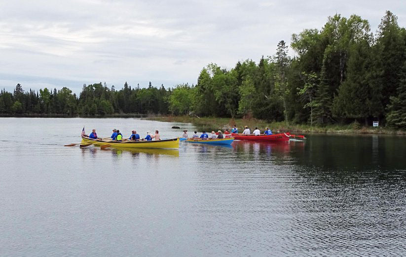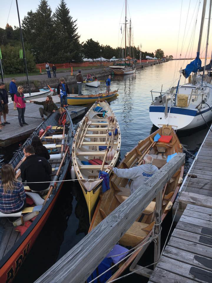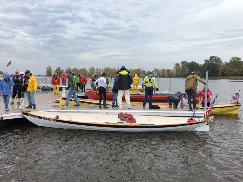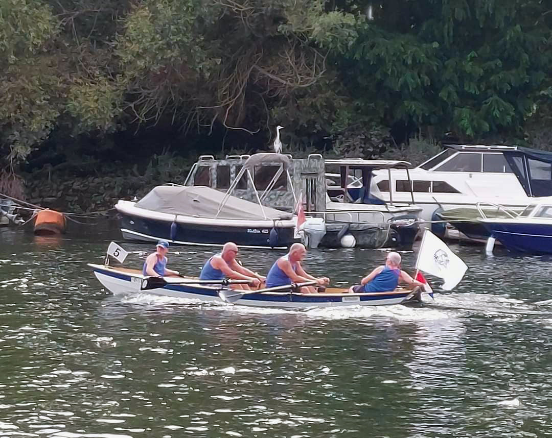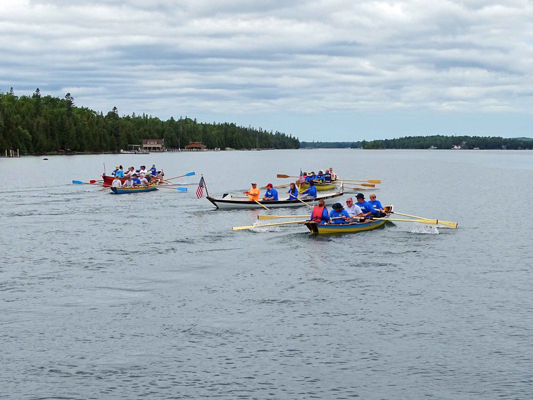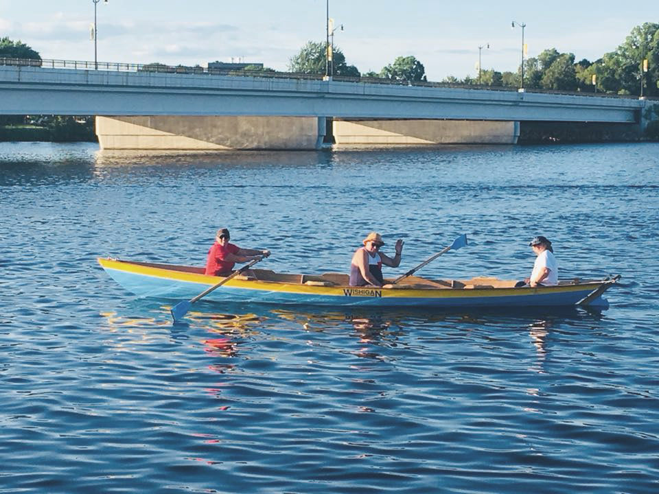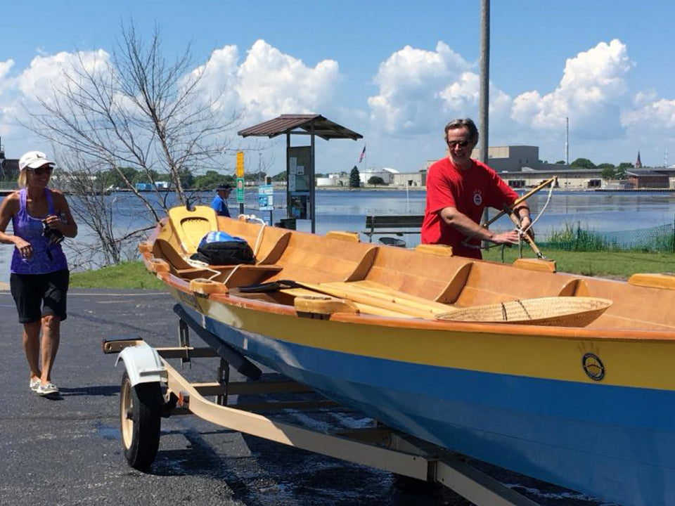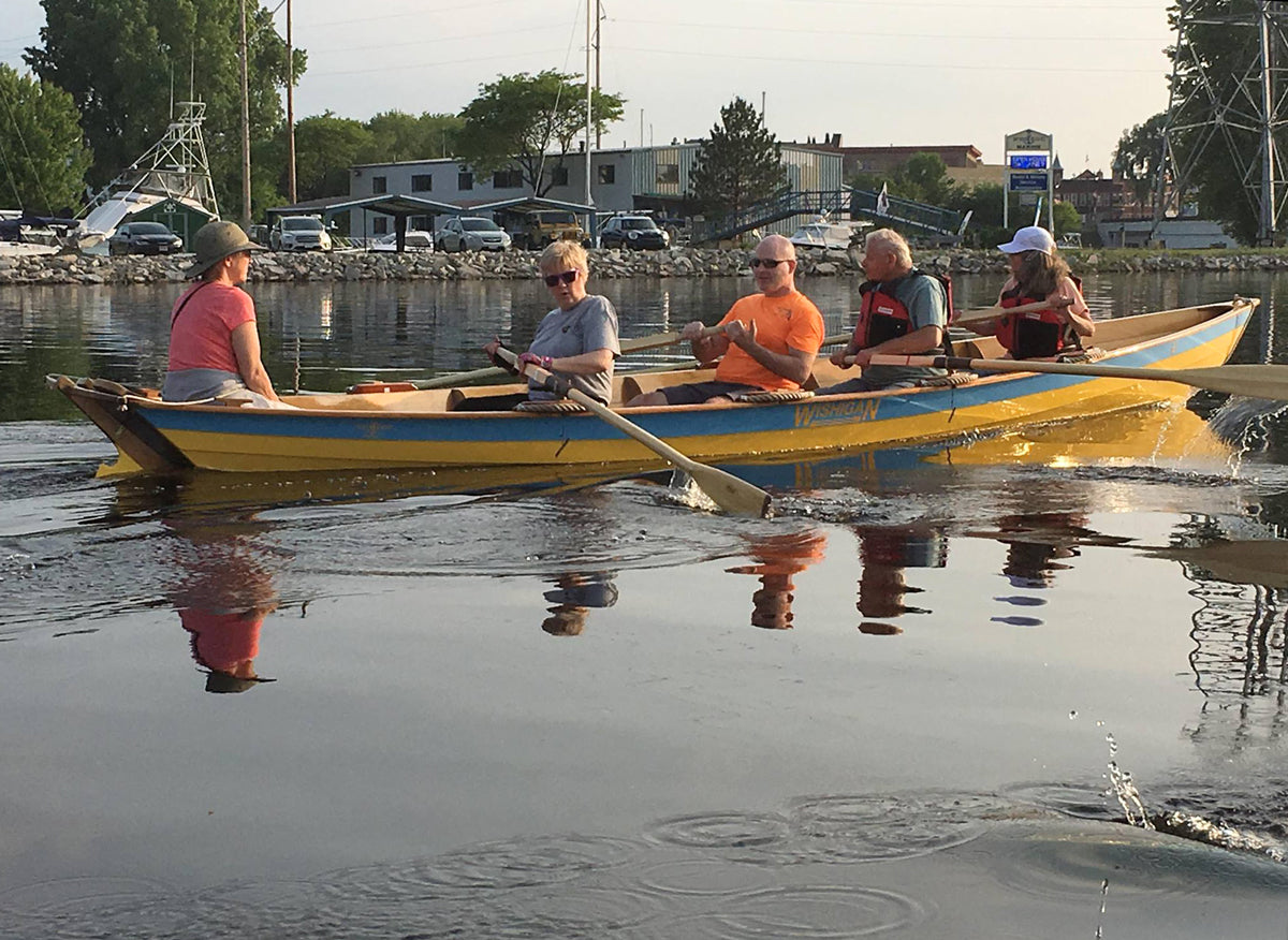 There are four sweeps, plus room astern for a coxswain. As you can see in the video, the boat is fast and stable. The interior layout allows a very wide range of crew weight and height, fitting rowers from about 5'6" to 6'6" tall. Integral flotation chambers allow the boat to be recovered and bailed unassisted, but from all the testing the boat seems to have excellent manners in waves and is a good match for expected currents and waves on rivers, bays, and alongshore.