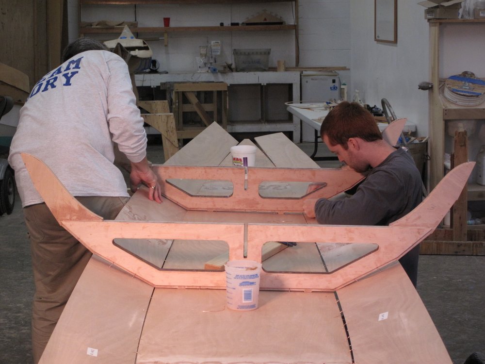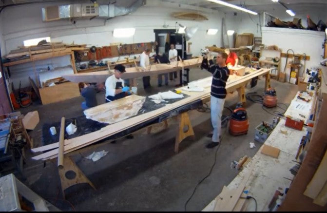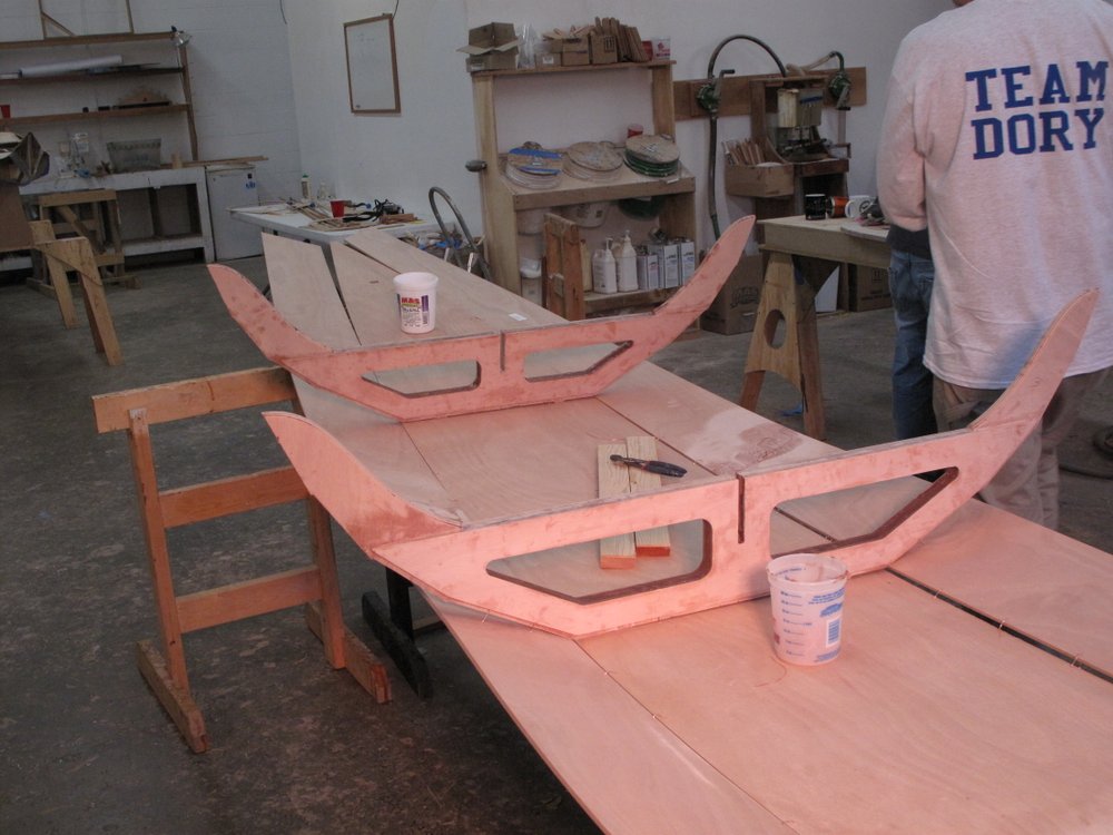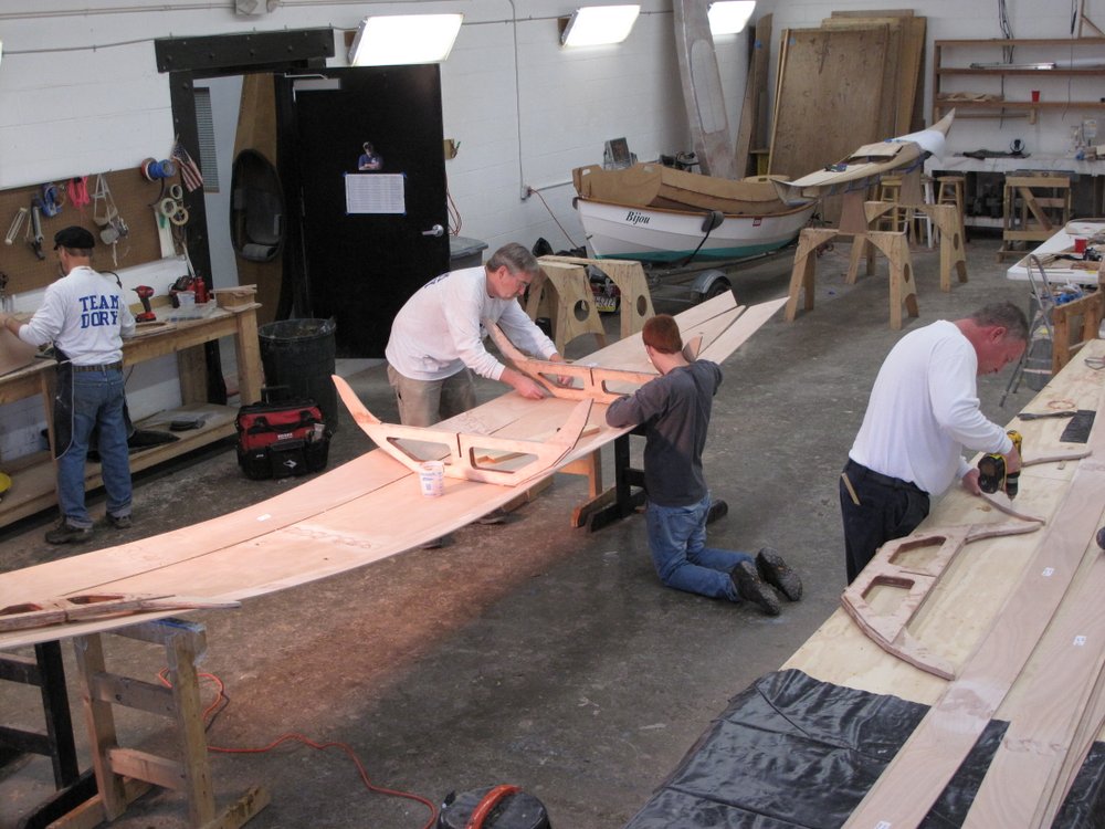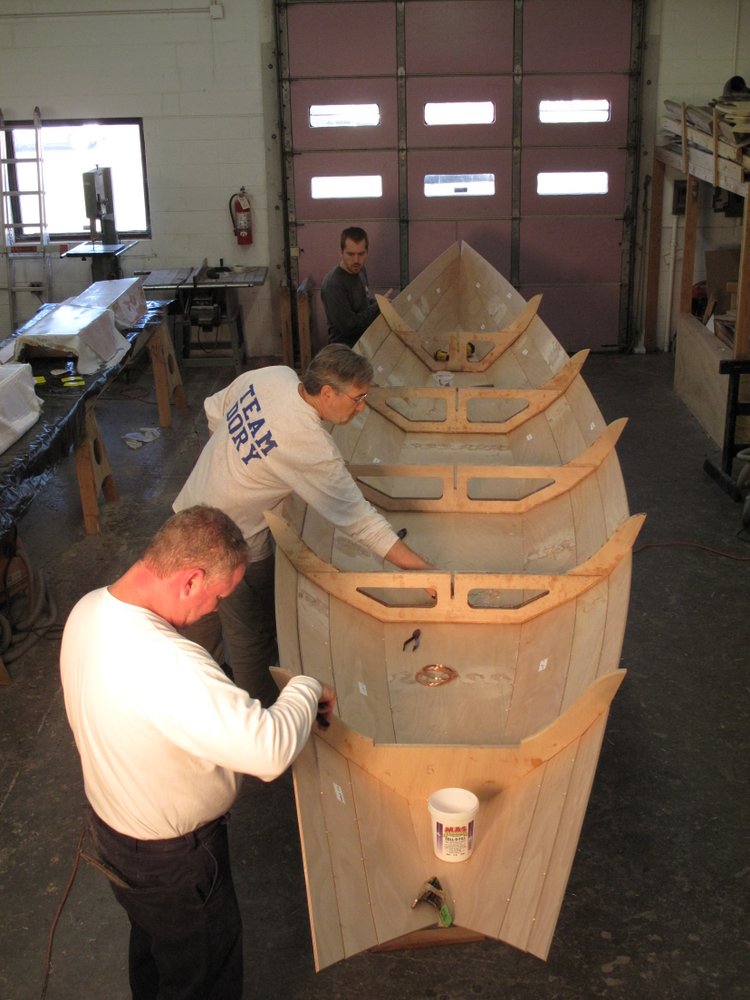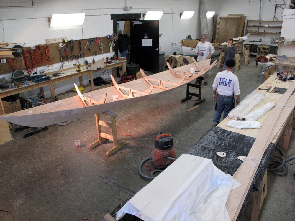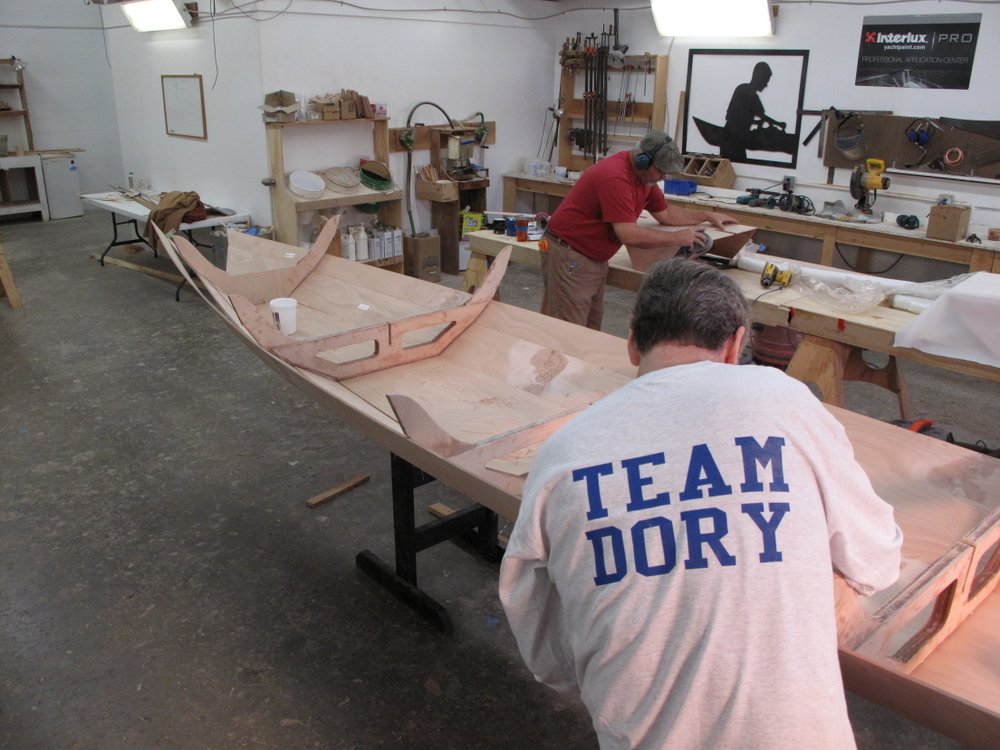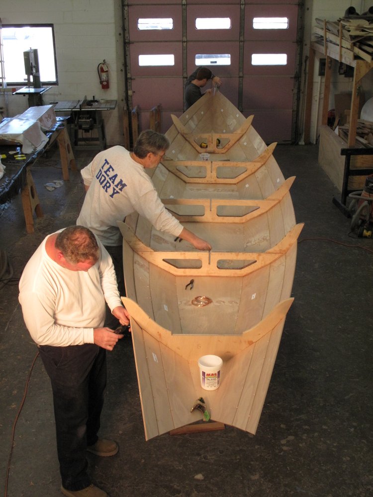 We've fixed that. The CLC Team Dory kit is suitable for amateur construction. A team of volunteers can build the hull in about 50 hours, plus another two or three weeks of part-time sanding and finishing. Total build time is 120-150 hours. The ease of construction and complete kit cost under $5,000 is a low barrier to entry. With sufficient space and volunteers. it would be plausible to build two or three of these in as little as a month, creating a fleet that's ready for competition, training, or adventure. Epoxy coating, strategically reinforced with fiberglass, keeps your maintenance chores near zero.