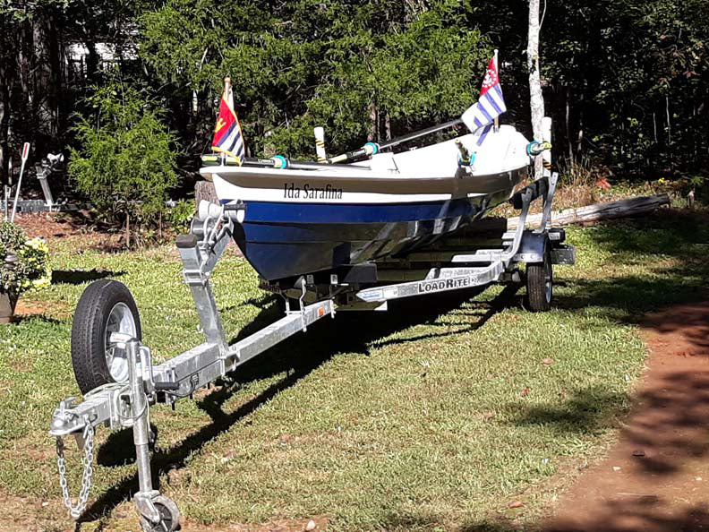 The hull weighs about 210 lbs.---a reasonably easy carry for the crew of five. It could be cartopped on a heavy truck, but the lightest of trailers is sufficient. The payload is about 1000 lbs.