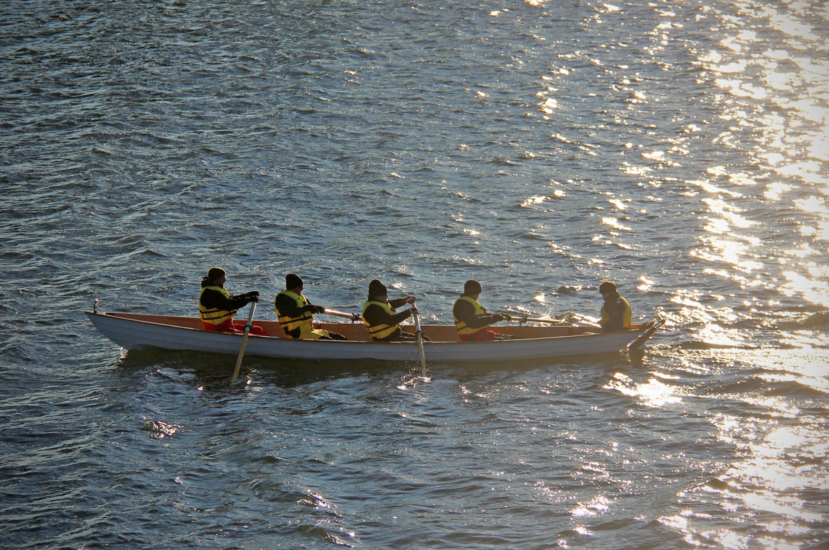 There are a number of multi-oared training craft designs out there, and they continue to gain in popularity with youth and adult rowing programs. Less skill is required to row a wherry-type hull like this, than in a narrow rowing shell, and with appropriate skill on board you may venture safely into cold, and even rough, water.