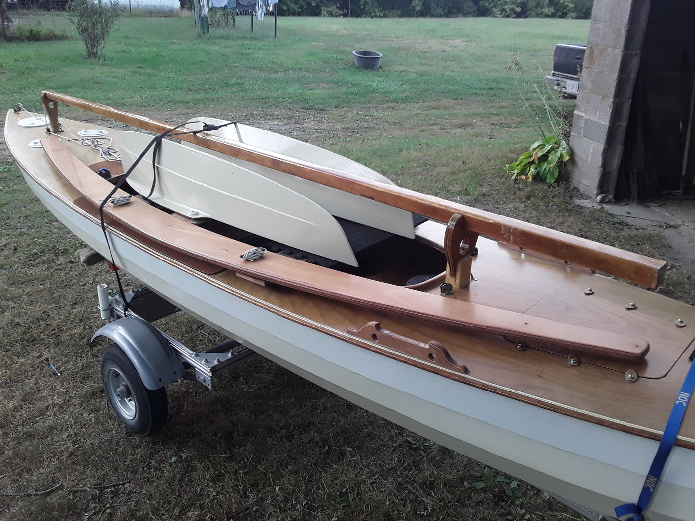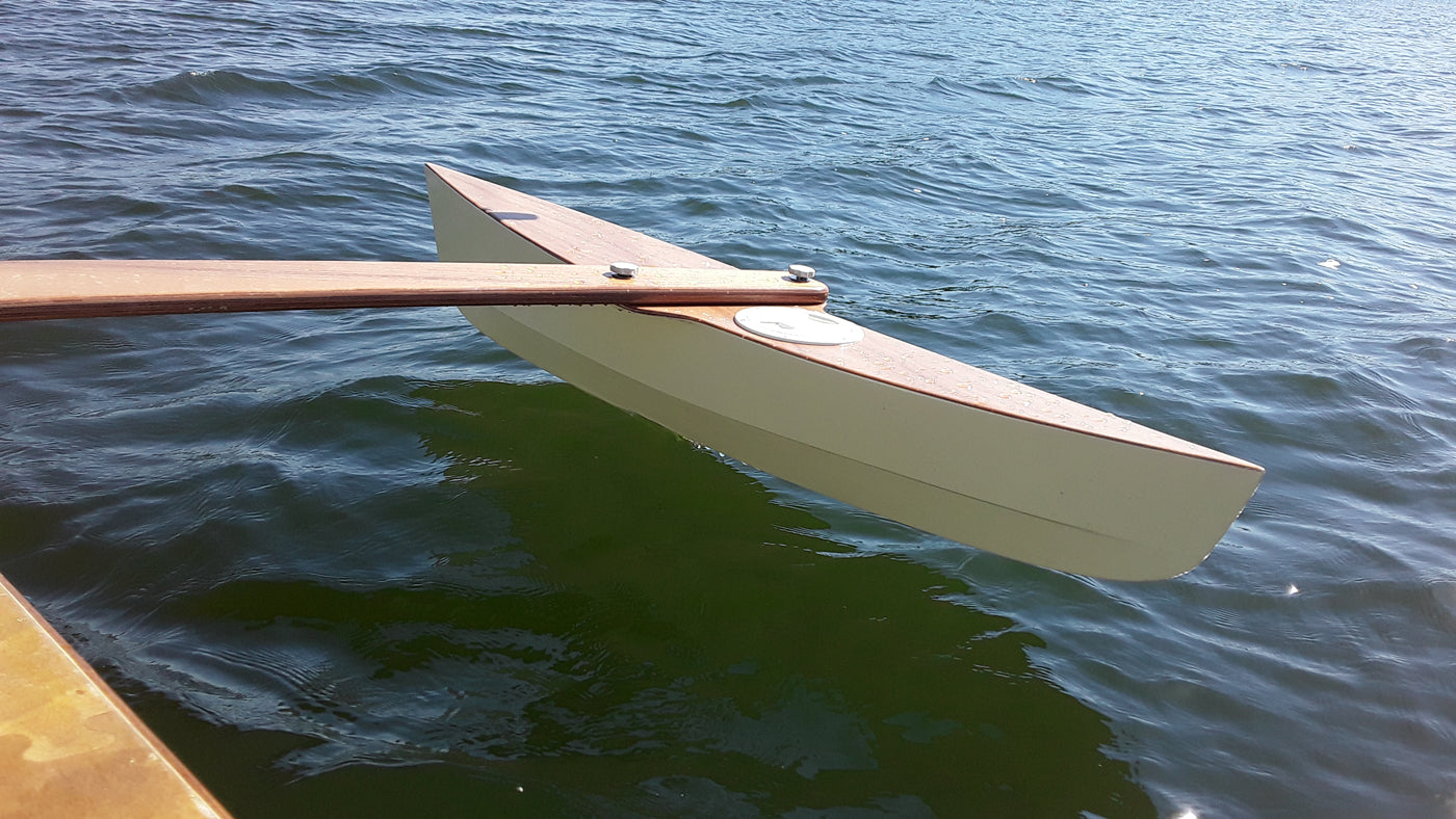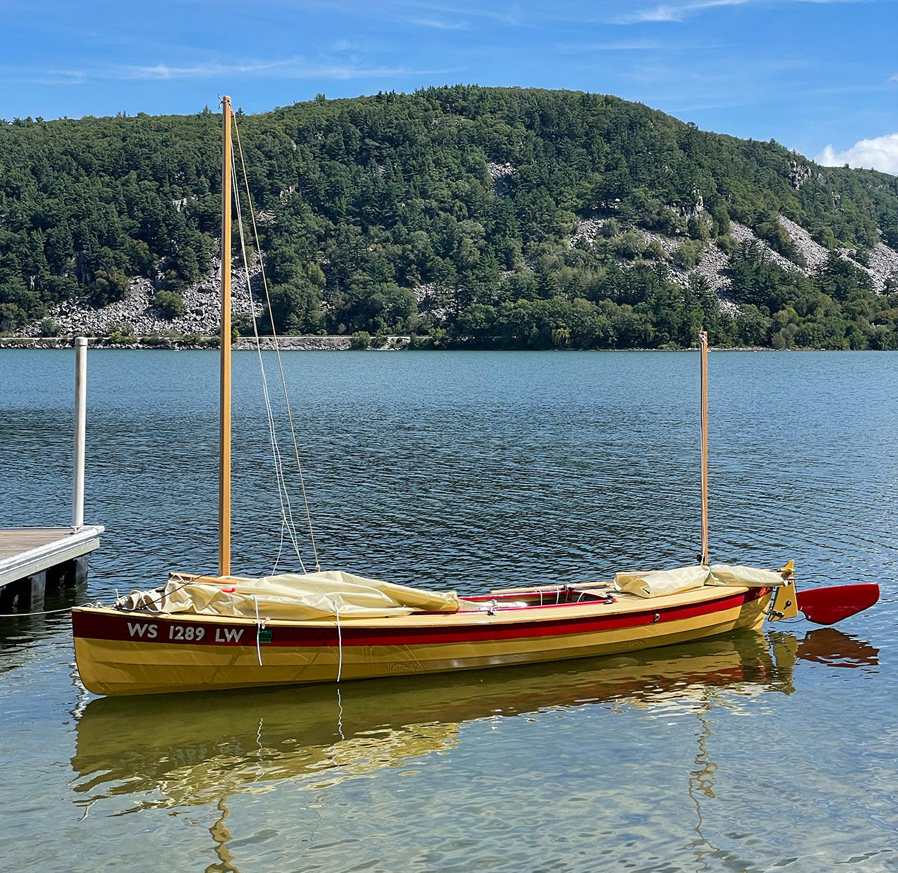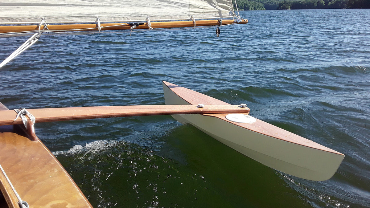 Dillon's elegantly proportioned design generated an avalanche of mail from small boat fanatics. There have been expedition-worthy sailing canoe designs for upwards of 150 years, but the combination of features that Dillon worked into this new design expand its appeal. The Hobie Mirage Drive, in particular, is a remarkable feature. GPS speeds upwards of 6 knots were recorded using the pedal drive alone. But perhaps the best thing about it is the ergonomic arrangement of the cockpit: "motorsailing" with the Mirage Drive is as natural as walking. For pure sailing, the Mirage Drive can be lifted out of its watertight trunk and stowed in the cockpit.