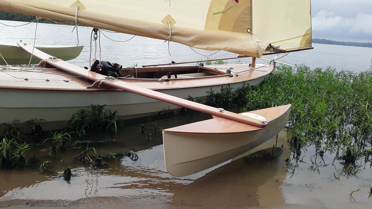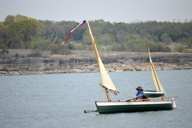 By pedantic definition the Waterlust Sailing Canoe is a cat-ketch, though in spirit it is a cat-yawl. (The mainsail provides most of the drive while the mizzen adds balance and off-wind power.) Those living in windy conditions may opt to set the main mast a bit further back and eliminate the mizzen. The boats are fast and close-winded under sail. Stability is surprisingly solid, though as in any sailing canoe you will not want to cleat the mainsheet!