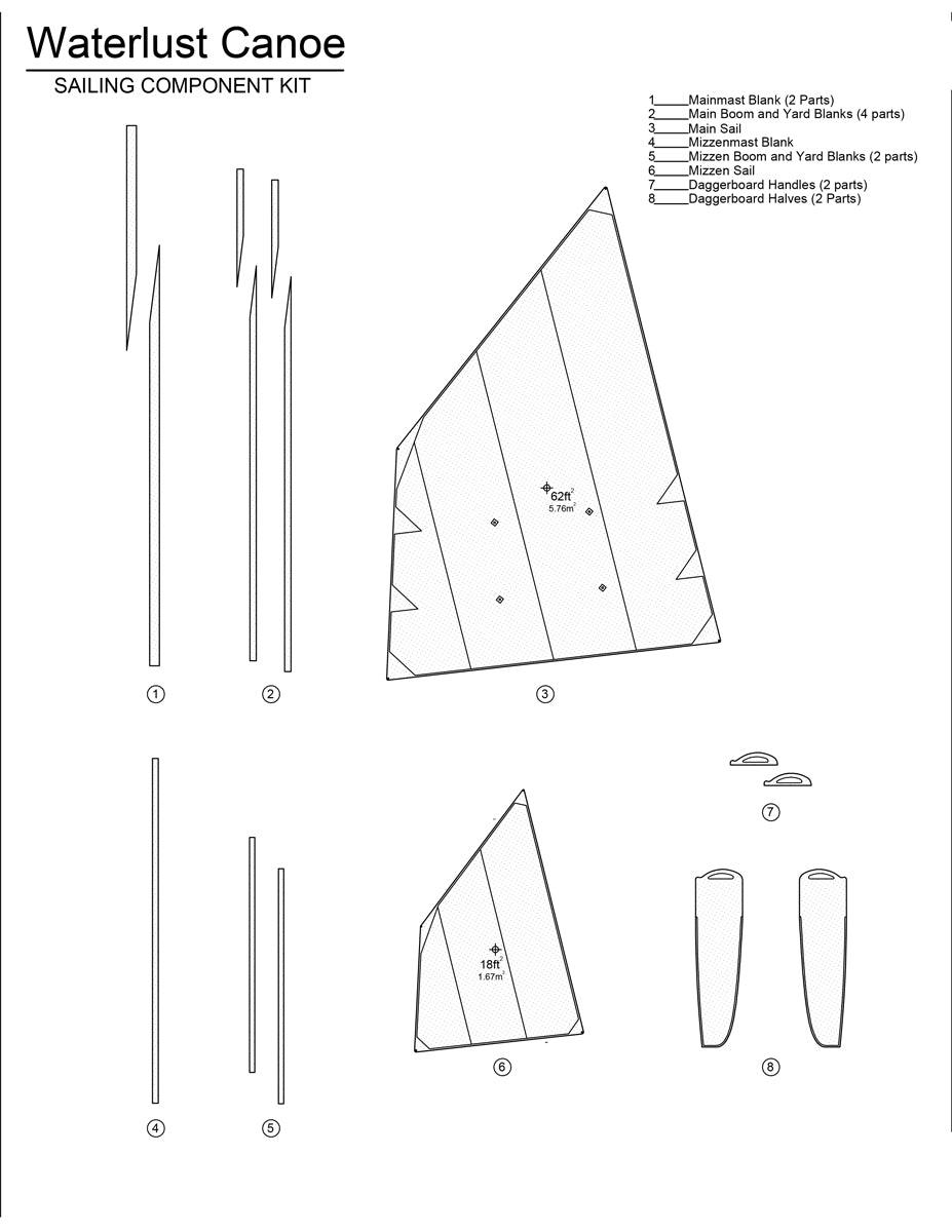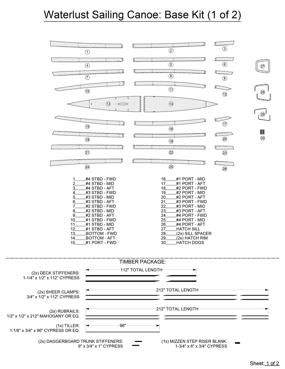 The base hull kit includes all of the computer-cut marine plywood parts, plus milled cypress and mahogany for stringers and trim. Copper wire, epoxy, and fiberglass, are also included. The sailing component package includes rudder, daggerboard, six spars, and both sails, white in color with one reef. (Hardware is sold separately for all versions.)
