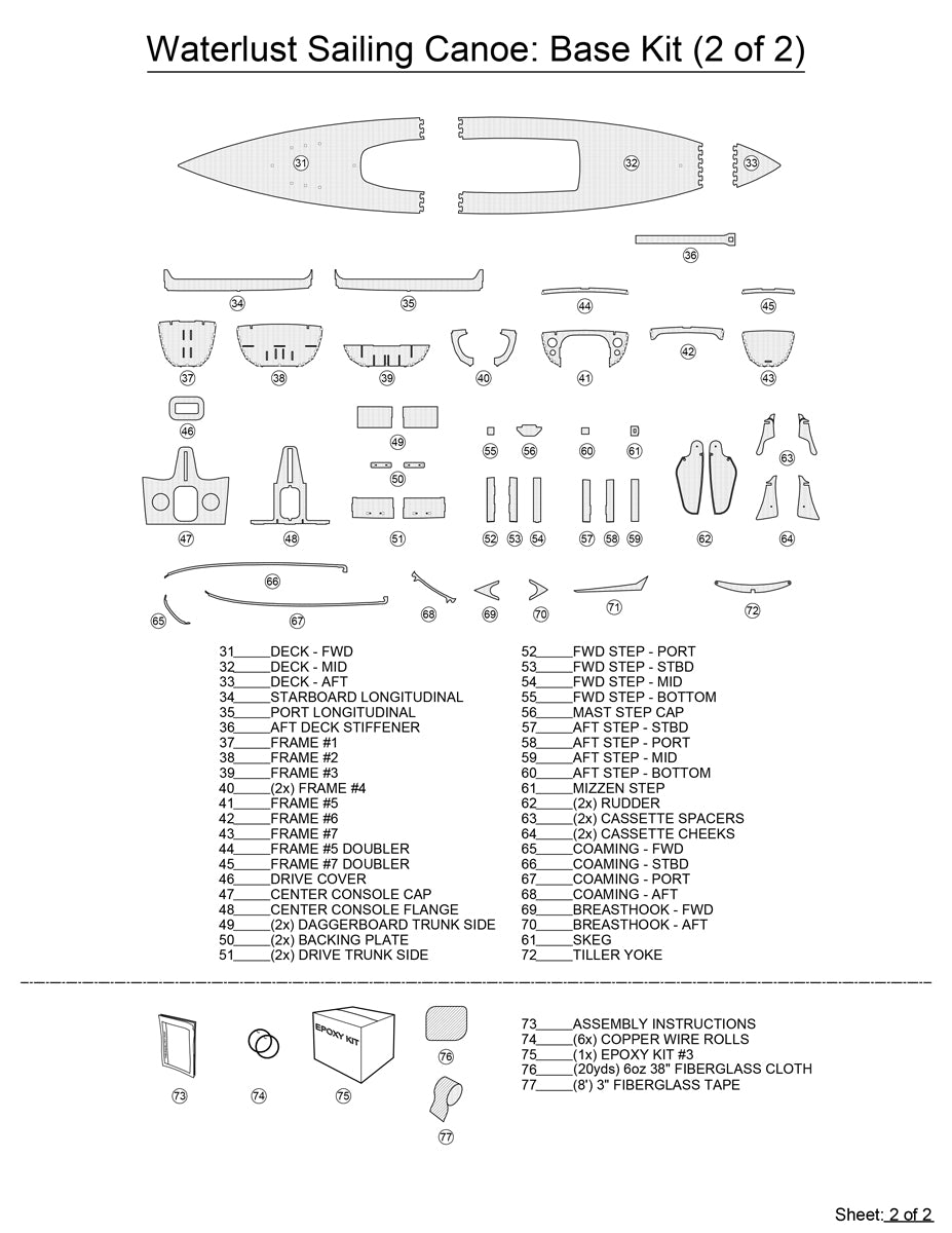 Construction is stitch-and-glue using CLC's LapStitch™ process. Computer-cut marine plywood panels are stitched together, forming the hull in a matter of hours. Sub-assemblies such as the Mirage Drive trunk and daggerboard trunk are built on the bench and dropped into the hull to be secured with epoxy fillets. Plenty of fiberglass cloth reinforcement and saturating coats of epoxy yield a stiff, rugged hull that weighs just about 80 pounds. Fully rigged, the Waterlust Sailing Canoe weighs about 115 pounds.