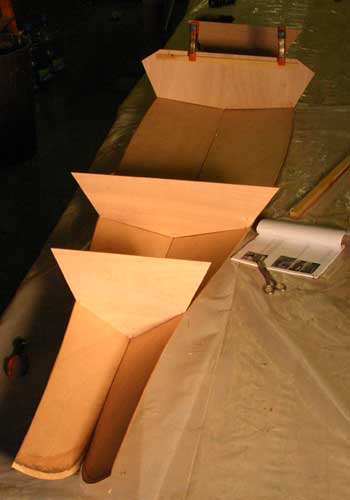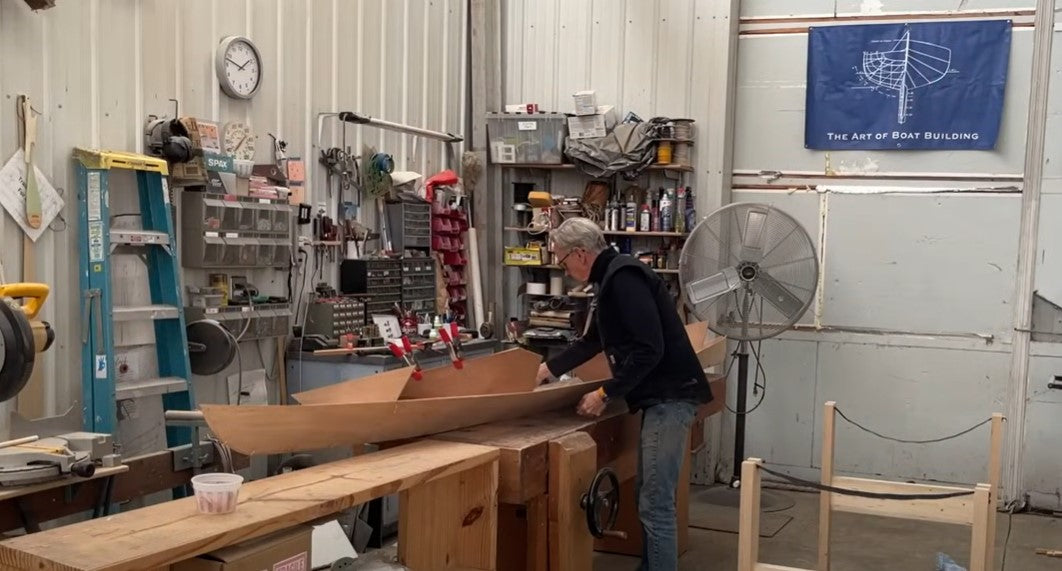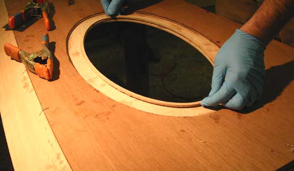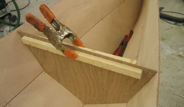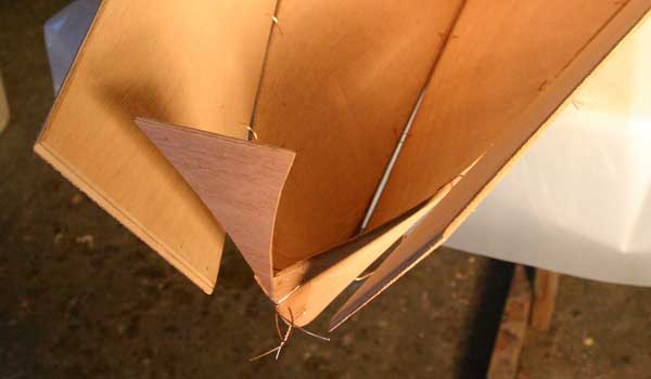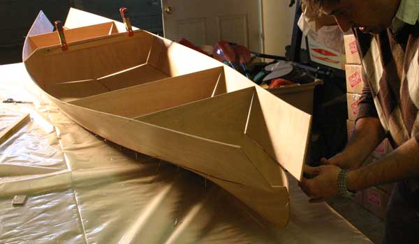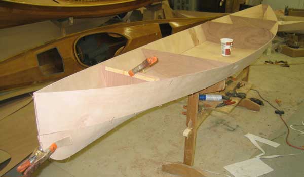 Construction begins by joining the plywood hull panels with “puzzle joints” to reach the 12-foot overall length. Then the panels are brought together along their edges with stitches of copper wire, with four bulkheads helping to give the hull shape. The seams are reinforced with thickened epoxy, then fiberglass fabric. The deck is assembled separately from the hull, then stitched and epoxied in place. All of the copper wire stitches are removed prior to the final sheathing of fiberglass fabric. Finally, the cockpit is laminated in place and the rear hatch assembled. A comfortable seat and footbraces, included in the kit, are mounted after the hull has been varnished.