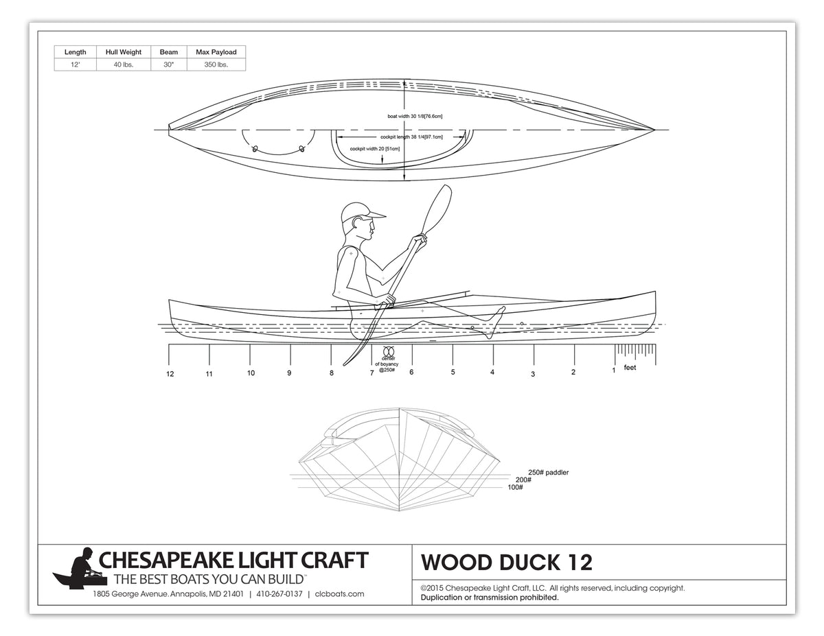 Capacity is ample and meant to accommodate a broad range of paddlers. Cockpits are 38 inches long, for easy in and out, and your legs and knees will not be confined. The Wood Duck 12 will easily handle a 275-pound person, plus gear. A flush hatch for the rear compartment is standard in all kits; an airtight oval VCP hatch is an option. In either case, both boats can carry a heavy payload in the fore and aft compartments, enough for picnicking, camping, or a whole lot of fishing gear.